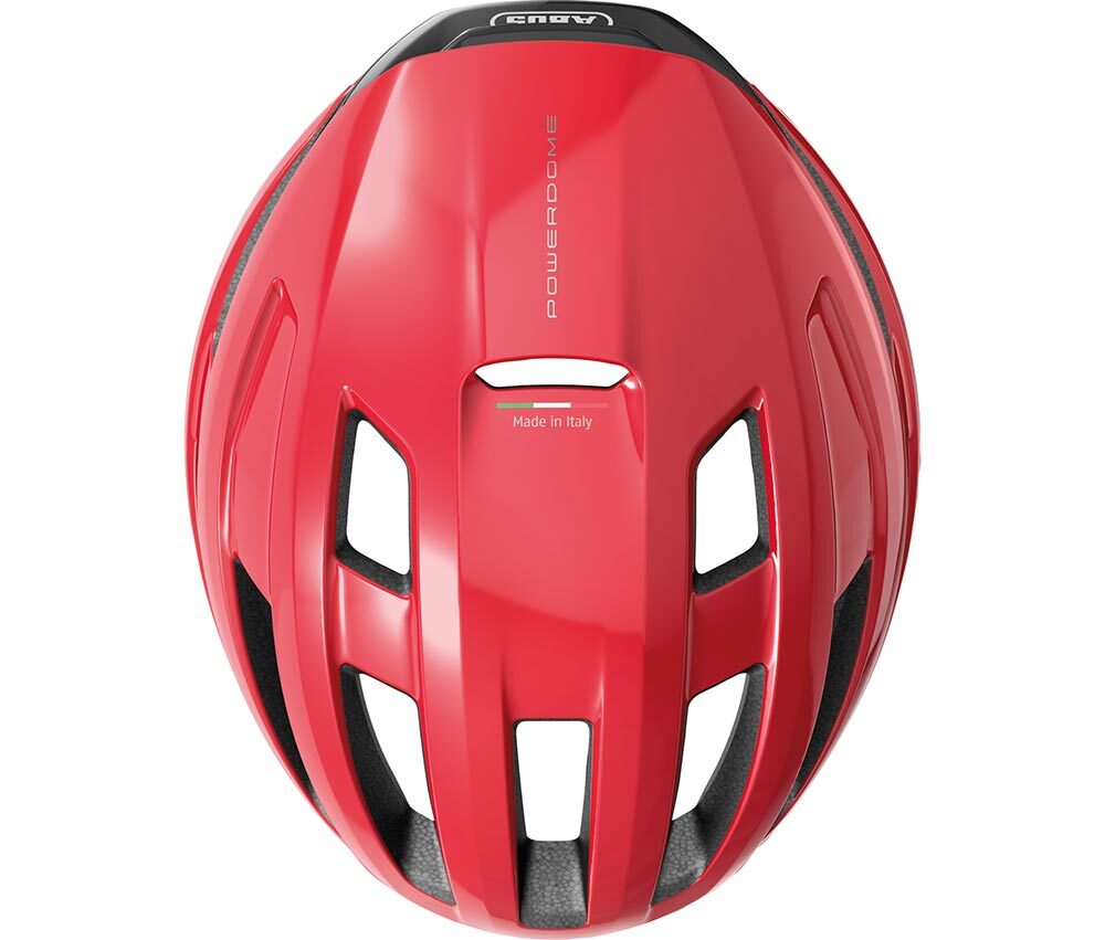 De ABUS PowerDome is een stijlvolle toevoeging op de toch al fraaie reeks Italiaanse helmen van ABUS. Met zijn uitstekende prijs-/kwaliteitverhouding vormt de PowerDome de perfecte racefietshelm voor zowel beginners als professionals. De helm is licht en eenvoudig aan te passen aan de hoofdomtrek met het Zoom Ace-verstelsysteem. De 10 luchtinlaten en 7 luchtuitlaten zorgen voor een optimale luchtcirculatie en koeling in elke situatie of positie. De harde schaal wordt tijdens de productie via een InMold-systeem met het absorberende EPS samengevoegd. De PowerDome ontleent zijn naam aan de fraai gevormde luchtinlaat op de bovenkant van de helm. De ontwerpers hebben zich hierbij laten inspireren door de luchtinlaat die vaak op high-performance sportauto’s is te zien. Een erg functioneel designelement dat bijdraagt aan de ventilatie en de aerodynamica. Het Floating-padding systeem vergroot het draagcomfort en de beweeglijkheid van de helm en maakt dat het binnenwerk snel kan drogen. Door de hoogteverstelling van het Zoom-Ace retentiesysteem is de helm ook uiterst geschikt voor renners en rensters met een paardenstaart. Dit alles maakt deze ABUS PowerDome tot een comfortabele, veilige, betaalbare en vooral stijlvolle aanwinst!