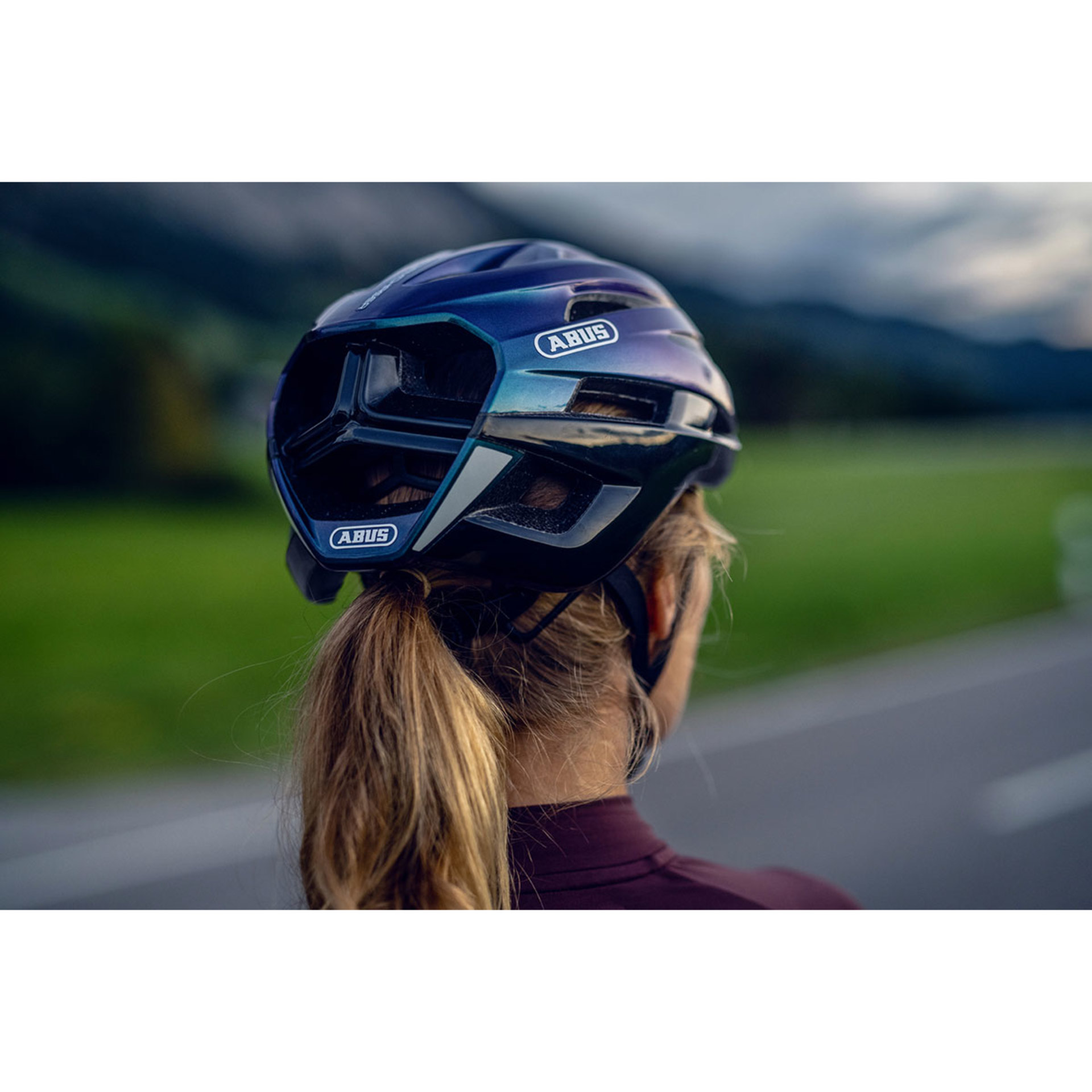 De Abus StormChaser Race Fietshelm is een zeer veilige en lichtgewicht helm. Hij is zeer geschikt om met een paardenstaart te dragen dankzij de grote opening aan de achterkant. Bovendien zorgt de in-mold schaal voor optimale bescherming wanneer je onverhoopt ten val komt. Dankzij de ventilatieopeningen blijft je hoofd goed geventileerd en je past de helm perfect aan de vorm van jouw hoofd aan met behulp van de verstelknop aan de achterkant. Hierdoor zit hij altijd goed en comfortabel. De reflecterende elementen zorgen ervoor dat je beter zichtbaar bent!