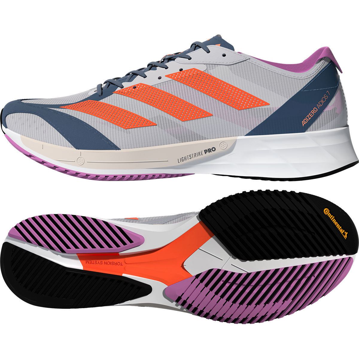 De adidas Adizero Adios 7 hardloopschoenen zijn ontworpen voor baantrainingen met tempo’s, maar zijn ook perfect op de weg en bij wedstrijden te gebruiken. De gebruikte materialen zijn superlicht van gewicht en sluiten nauw aan om je voeten. Daarmee zetten ze je voeten klemvast en ben je klaar voor razendsnelle lopen over de weg en op de baan. De Lightstrike demping zorgt voor een laag gewicht en veel responsiviteit. Lightstrike Pro is het meest veerkrachtige schuim van adidas en wordt ingezet voor schoenen die gemaakt zijn op snelheid te maken. TorsionROD’s maken daarnaast de zool nog stijver en geven je een extra push bij iedere stap. De onderzool van Continental rubber geeft ook in natte omstandigheden geweldige tractie en grip.