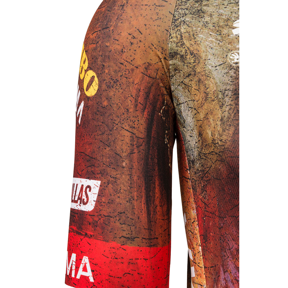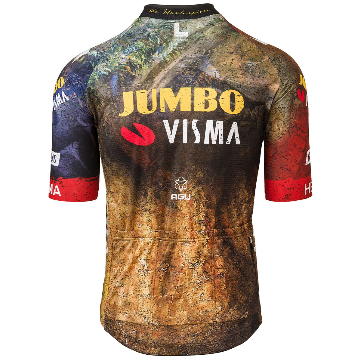 Het AGU Jumbo-Visma Replica TDF 2022 Fietsshirt is het officiële Team Jumbo-Visma fietsshirt voor de Tour de France van 2022. Alle renners van Team Jumbo Visma rijden tijdens de Tour in dit shirt. Deze zogeheten ‘Masterpiece’ collectie is geïnspireerd door de drie grote Hollandse Meesteres Rembrandt, van Gogh en Vermeer. Hiermee haal je dus echt iets speciaals in huis. De lasergesneden mouwen sluiten mooi aan om je armen. In de drie steekzakken aan de achterkant heb je voldoende plek voor kleine accessoires, zoals je telefoon of een energiereep. Dankzij de volledige ritssluiting trek je dit shirt gemakkelijk aan en uit. Bovendien heeft dit shirt een hoog ademend vermogen waardoor zweet goed wordt afgevoerd.