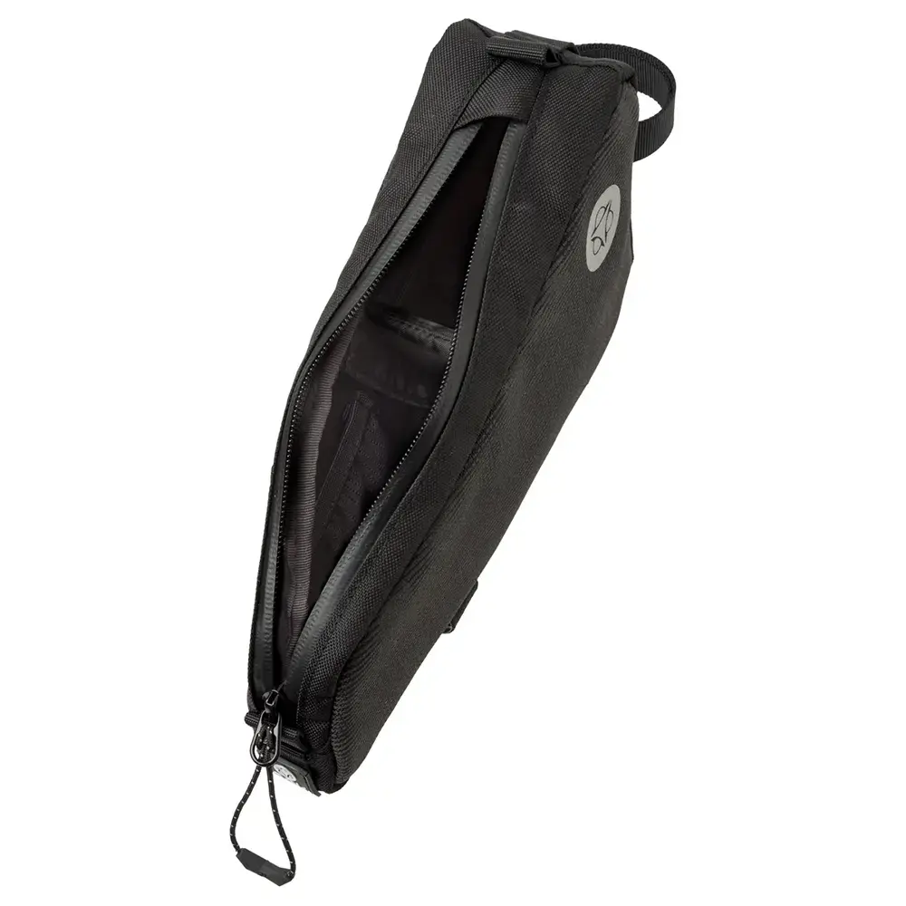 De AGU Venture 0,7L frametas is ideaal wanneer je gaat bikepacken in wisselvallig weer. De tas is waterafstotend, waardoor ook in een lichte regenbui je spullen gewoon droog blijven. De tas is gemaakt van 100% gerecycled polyester met een PFC-vrije DWR coating en is voorzien van een waterafstotende ritsluiting. Deze laatste is met één hand te openen, waardoor je tijdens het fietsen een gelletje of reep kunt pakken uit de tas. De tas bevestig je gemakkelijk middels straps aan je frame. De binnenzijde van de tas is rood gekleurd, zodat je je spullen goed kunt zien. Ook is de binnenzijde verdeeld middels een (uitneembare) vakverdeler en twee mesh vakjes, hierdoor ben je nooit naar je spullen aan het zoeken.