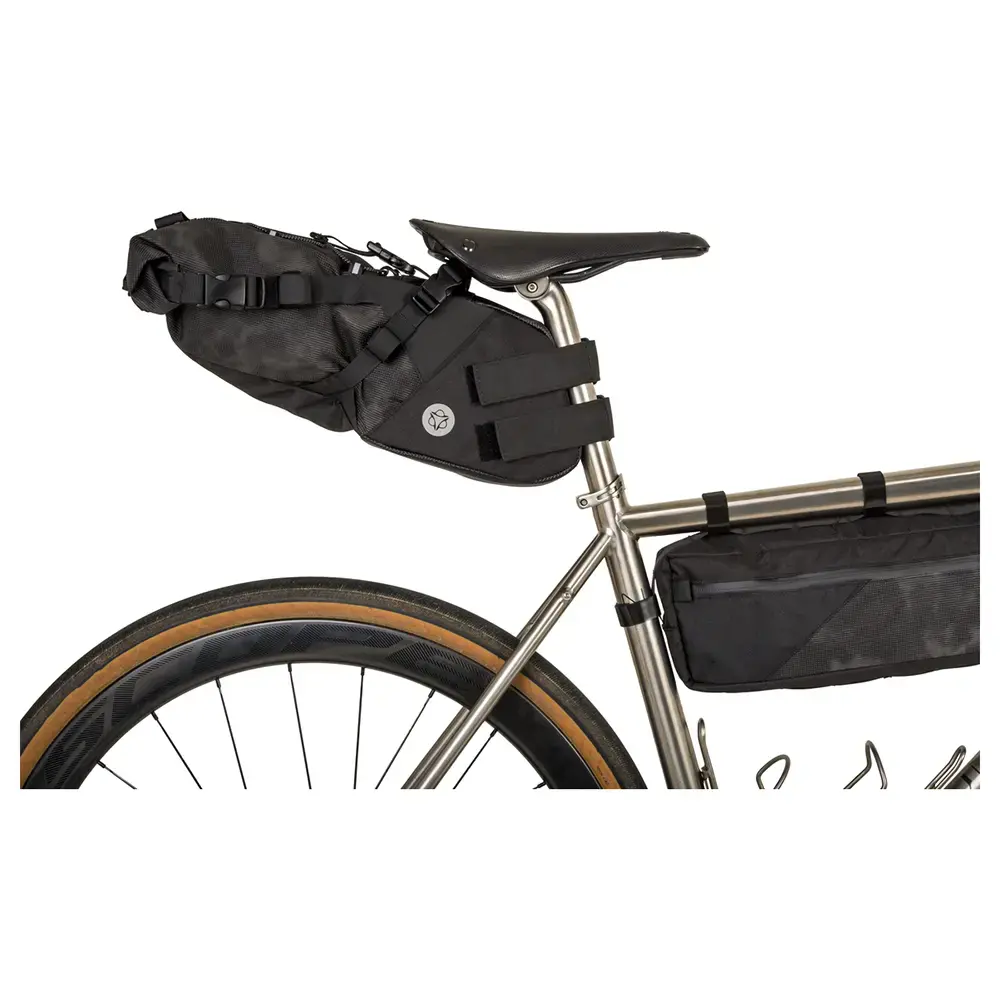 De AGU Venture 10L Zadeltas is ideaal wanneer je gaat bikepacken in wisselvallig weer. De tas is waterdicht, waardoor ook in een lichte regenbui je spullen gewoon droog blijven. De tas is gemaakt van 100% gerecycled polyester met waterdichte Dryliner technologie en is voorzien van een waterdichte rolsluiting. De tas is perfect om een extra setje kleding mee te nemen, of een kleine slaapzak. De tas bevestig je gemakkelijk middels straps aan je zadelpen. De compressiestraps maken het mogelijk de bagage zo strak mogelijk de tas te houden. Dit houdt het geheel zo compact mogelijk maar voorkomt ook het bewegen van de bagage.