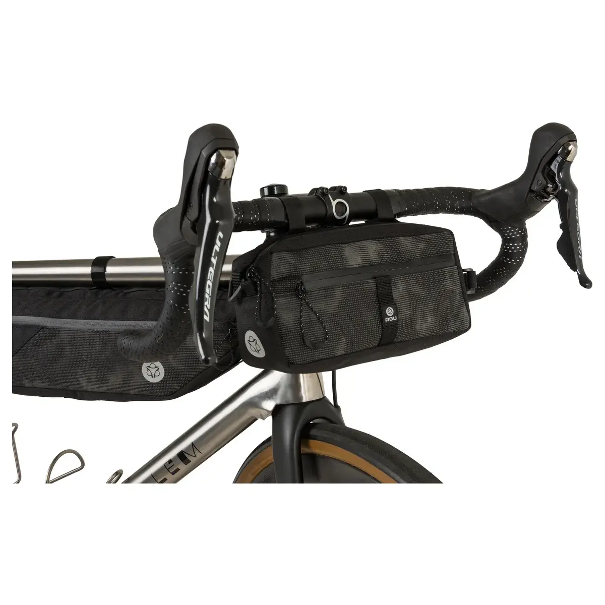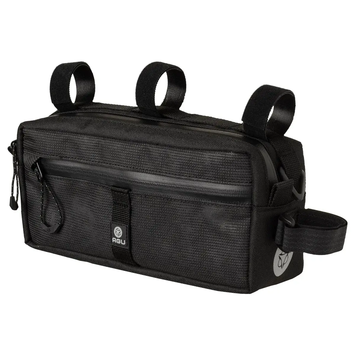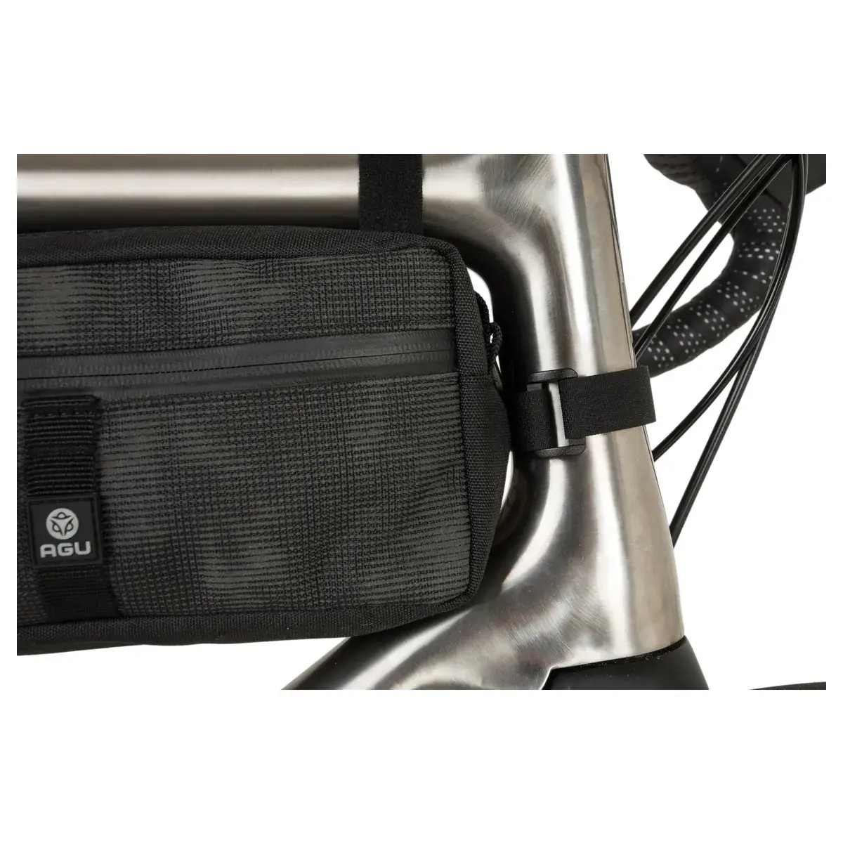 De AGU Venture 2L Stuurtas bevestig je snel en stevig op het stuur van je fiets om je benodigde spullen binnen handbereik te hebben. De tas zet je vast op de fiets met klittenband straps, waardoor je de tas eenvoudig los kunt halen. De tas bestaat uit een hoofdvak met een aantal mesh vakjes en een uitneembare vakverdeler. Aan de voorzijde is een strap aangebracht waar je een voorlamp aan kunt bevestigen. Dankzij de verwijderbare schouderband neem je de tas makkelijk mee van de fiets. De tas is waterafstotend waardoor je spullen ook in lichte regen gewoon droog blijven. De DWR coating is PFC vrij en de tas is gemaakt met gerecycled polyester.