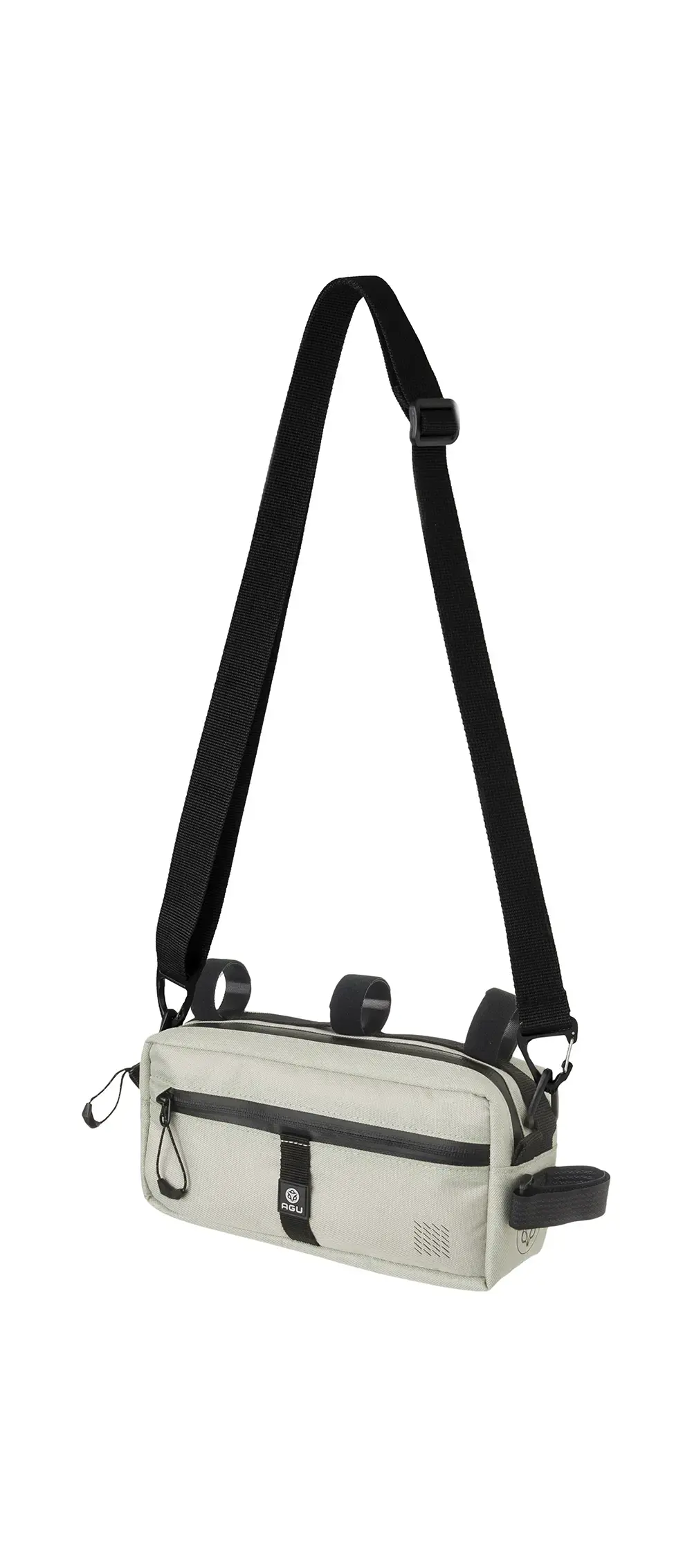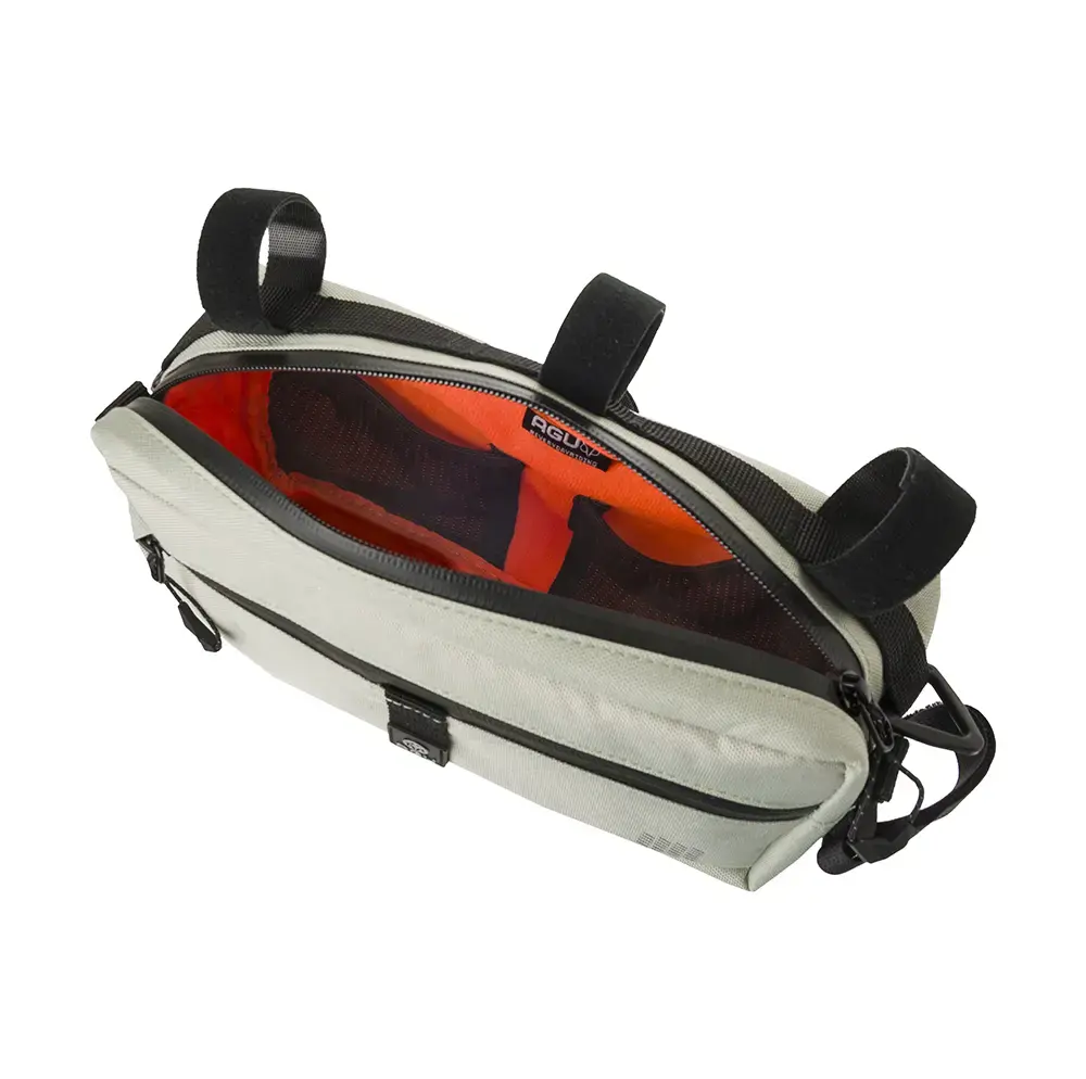 De AGU Venture 2L Stuurtas bevestig je snel en stevig op het stuur van je fiets om je benodigde spullen binnen handbereik te hebben. De tas zet je vast op de fiets met klittenband straps, waardoor je de tas eenvoudig los kunt halen. De tas bestaat uit een hoofdvak met een aantal mesh vakjes en een uitneembare vakverdeler. Aan de voorzijde is een strap aangebracht waar je een voorlamp aan kunt bevestigen. Dankzij de verwijderbare schouderband neem je de tas makkelijk mee van de fiets. De tas is waterafstotend waardoor je spullen ook in lichte regen gewoon droog blijven. De DWR coating is PFC vrij en de tas is gemaakt met gerecycled polyester.