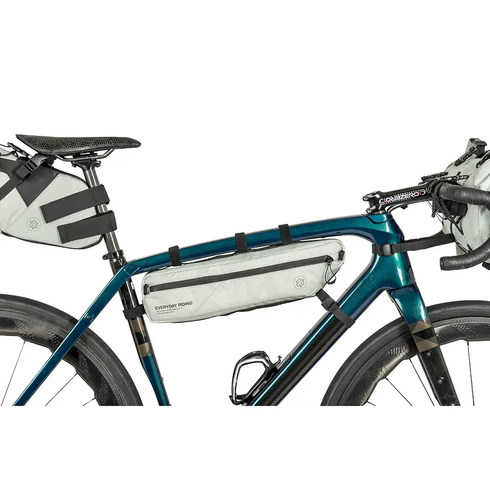 De bevestiging met klittenband rondom de balhoofdbuis en de schuine buis is eenvoudig te doen en houdt de tas stevig op zijn plek. Zelfs tijdens ruigere ritten over onverharde paden blijft de tas stabiel zitten. De positionering in het frame zorgt ervoor dat het zwaartepunt laag blijft en ik niet het gevoel heb dat ik extra gewicht hoog op mijn fiets heb.