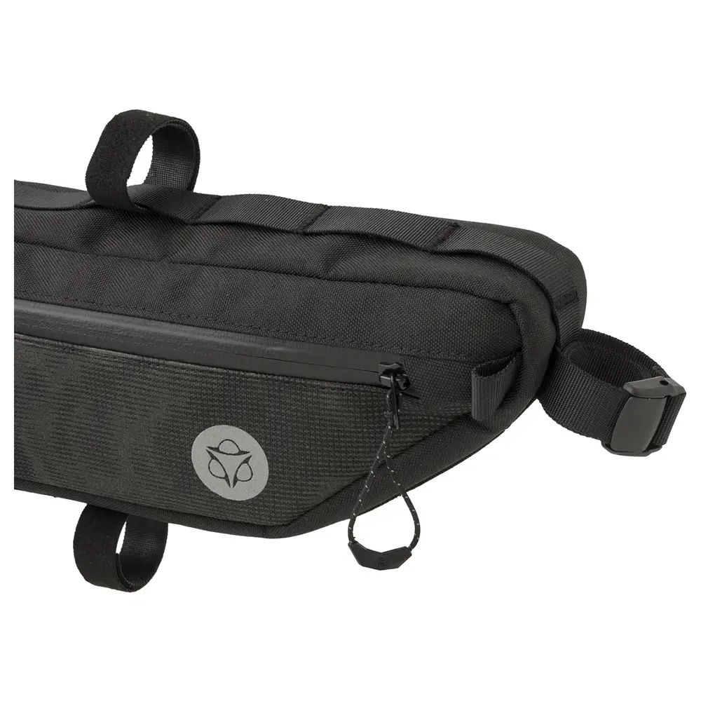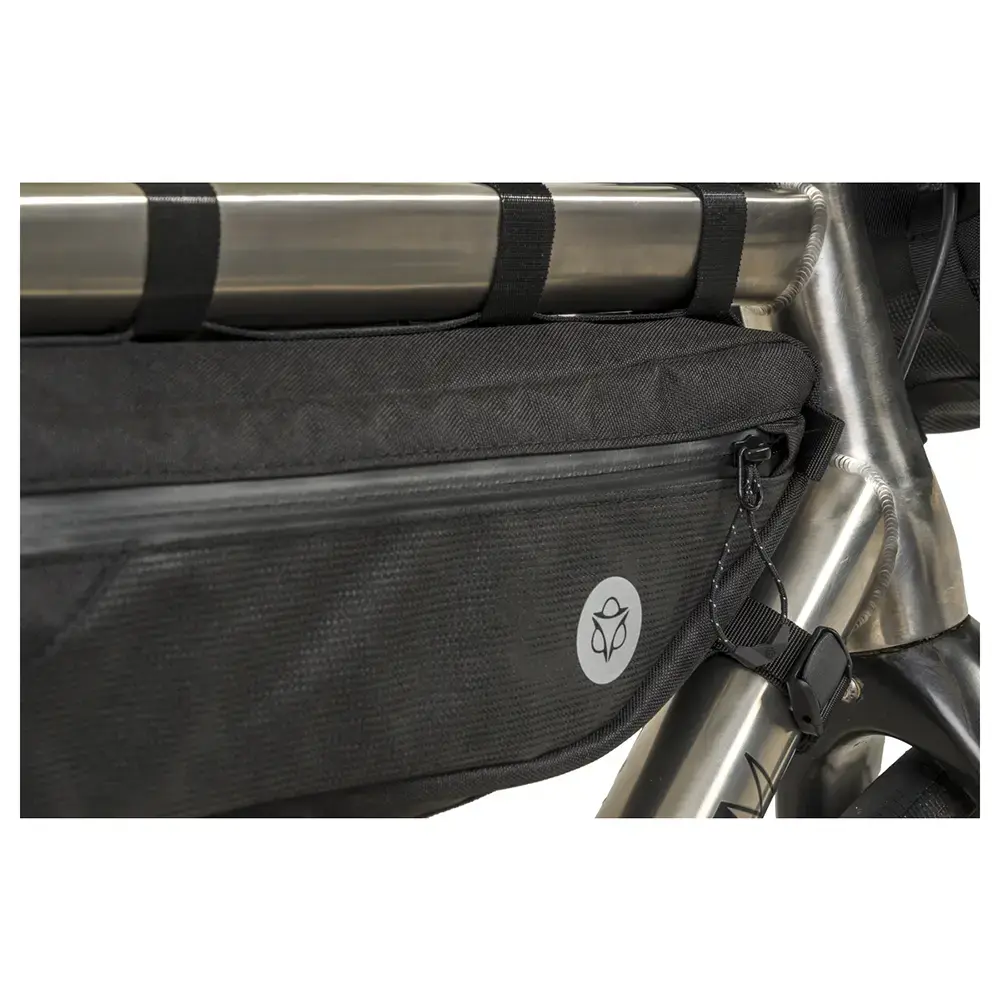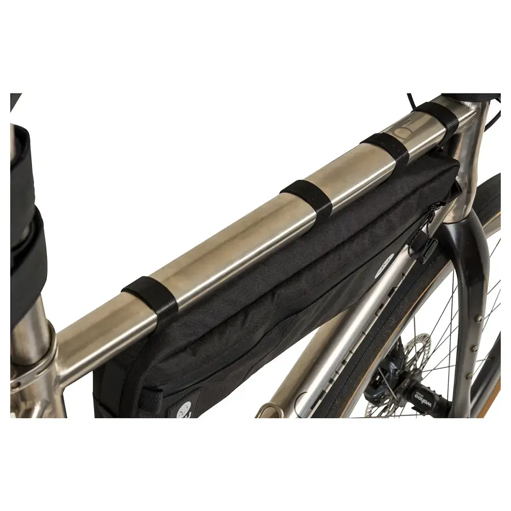 De bevestiging met klittenband rondom de balhoofdbuis en de schuine buis is eenvoudig te doen en houdt de tas stevig op zijn plek. Zelfs tijdens ruigere ritten over onverharde paden blijft de tas stabiel zitten. De positionering in het frame zorgt ervoor dat het zwaartepunt laag blijft en ik niet het gevoel heb dat ik extra gewicht hoog op mijn fiets heb.