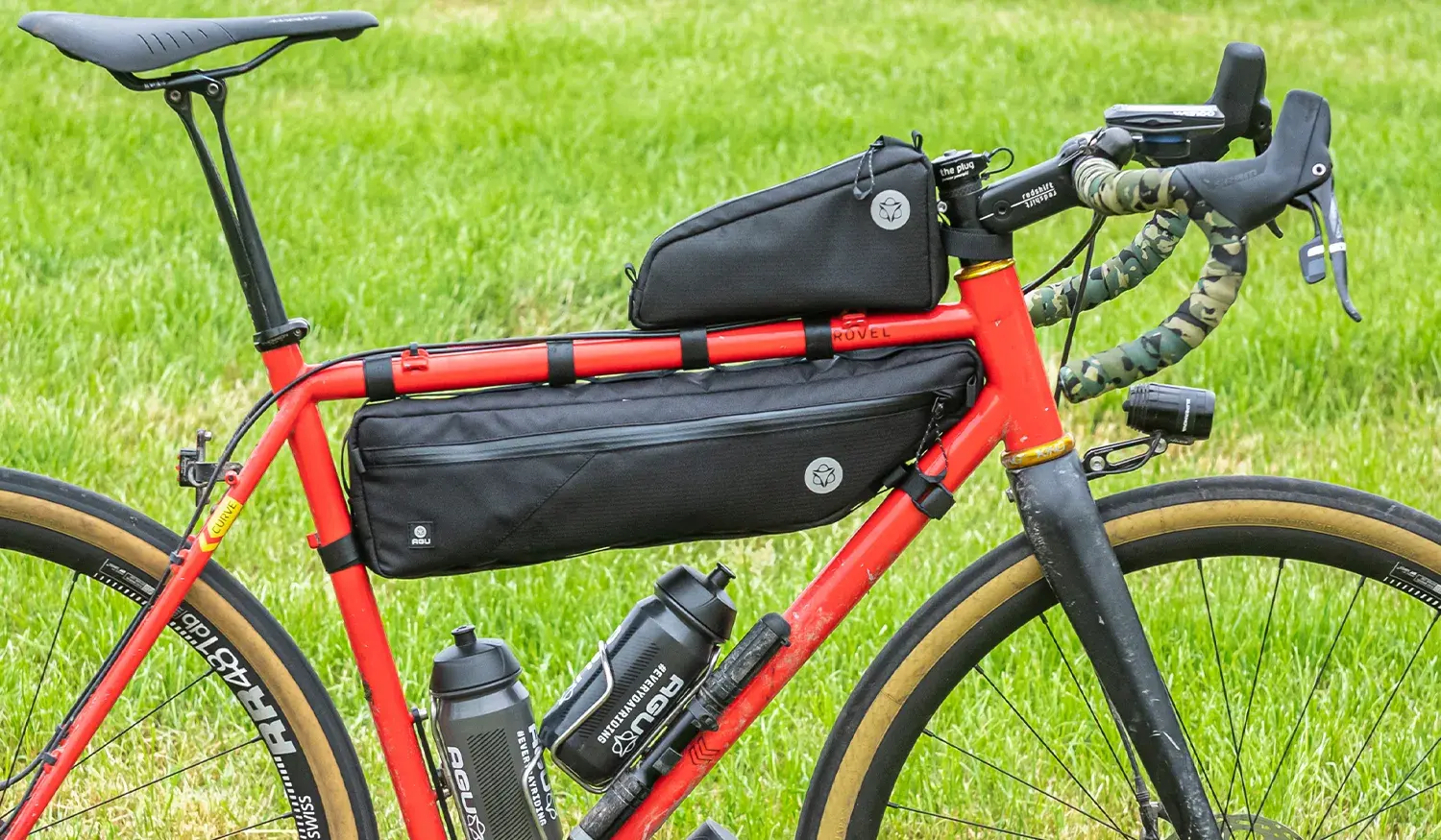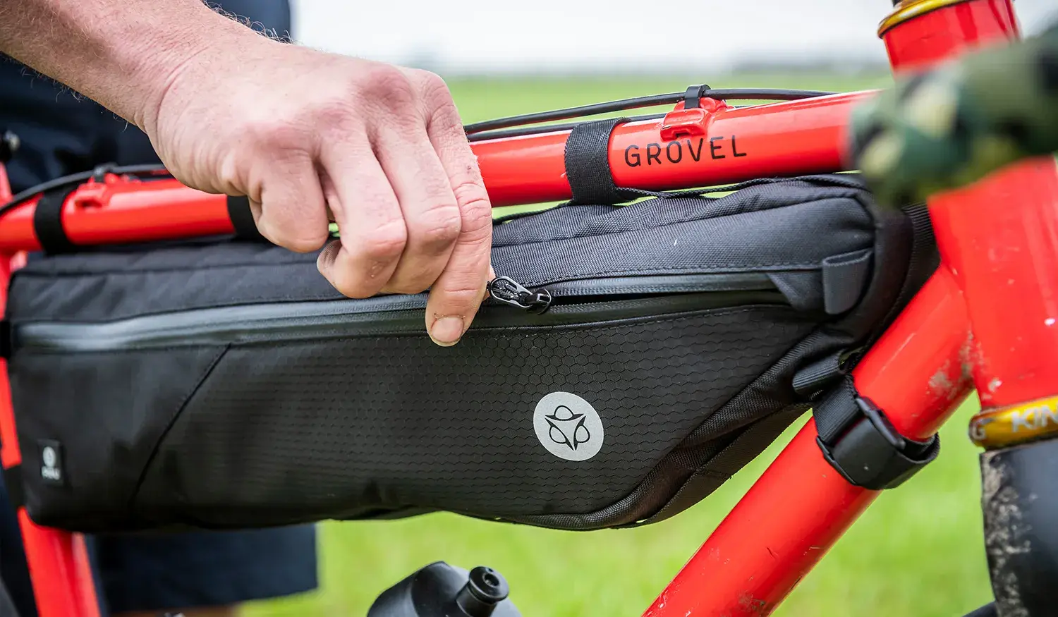 Top product met een oranje binnenkant zodat je alle spullen goed kunt zien. Vakjes om platte spullen in te stoppen en mogelijkheid om 2 compartimenten te maken. Ik zou AGU willen aanbevelen iets te doen aan klittenband waarmee je de tas vastmaakt aan bovenbuis van je frame. Wanneer je daar met je fietsbroek (lycra) op gaat zitten gaat na verloop van tijd je broek pluizen. En dat gebeurt best vaak op een dag gravelen. Naar voren afstappen om hekje te openen, etc etc. Je hebt nogal eens je frame tussen beide benen. Dag 2 van de Green Divide opgelost met stukje tape over klittenband.