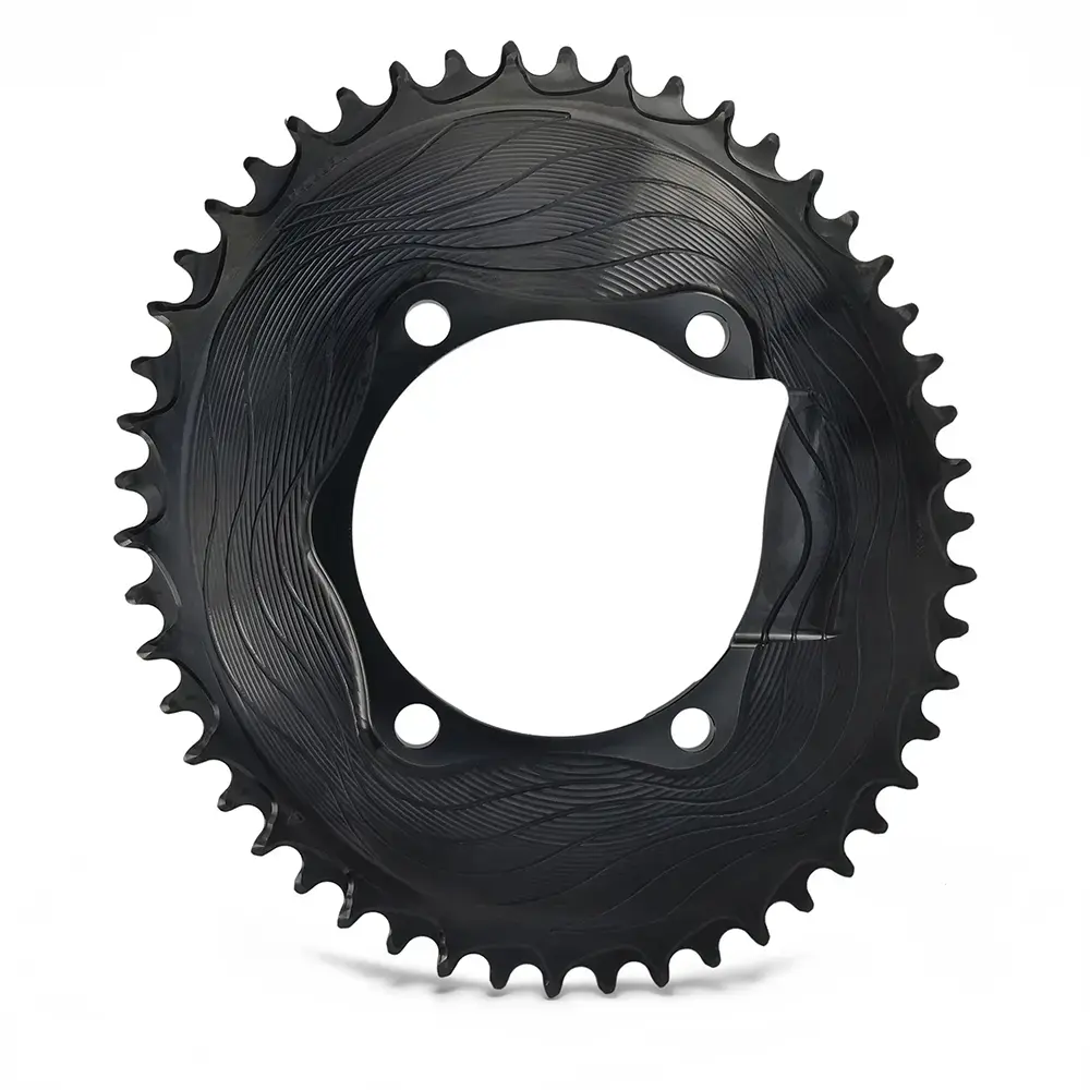 Het Alugear Round Single 110 BCD 4b Shimano Asym. Road Kettingblad is een ultralicht en technologisch geavanceerd kettingblad, ontworpen voor rijders die een 1x-aandrijflijn willen zonder voorderailleur. Dit narrow-wide kettingblad zorgt voor optimale kettinggeleiding, vermindert slijtage en elimineert kettinggeluiden. CNC-gefreesd uit hoogwaardig 7075-T6 aluminium en voorzien van een industriële anodisatie voor extra duurzaamheid en bescherming tegen mechanische impact. Compatibel met Shimano 2x11 cranks met Dura-Ace, Ultegra en 105, maar niet met cranks met een geïntegreerde vermogensmeter.