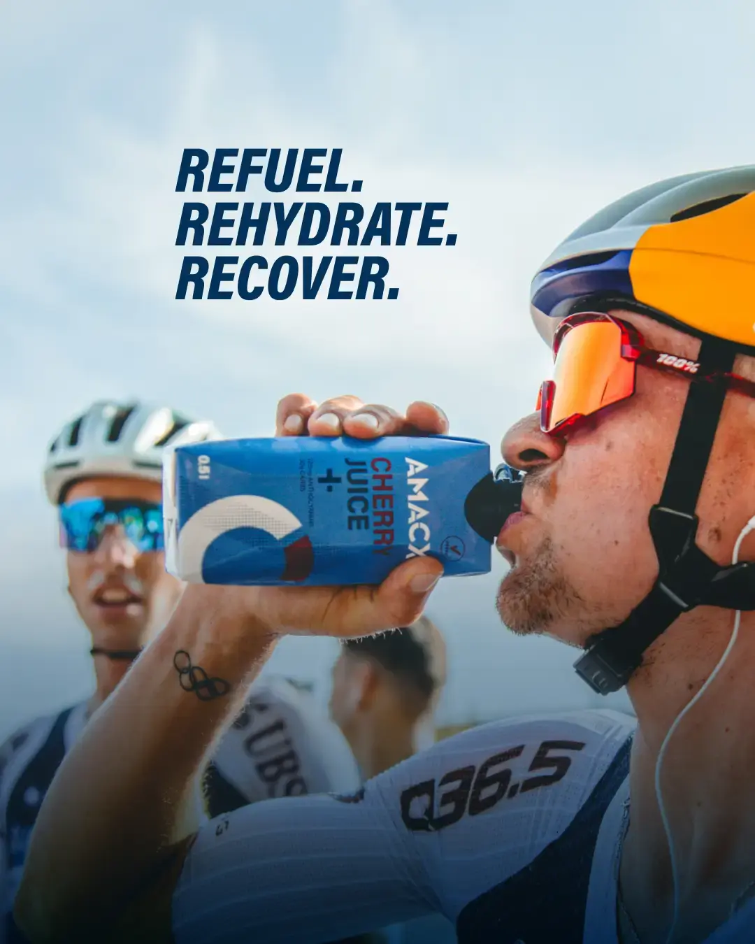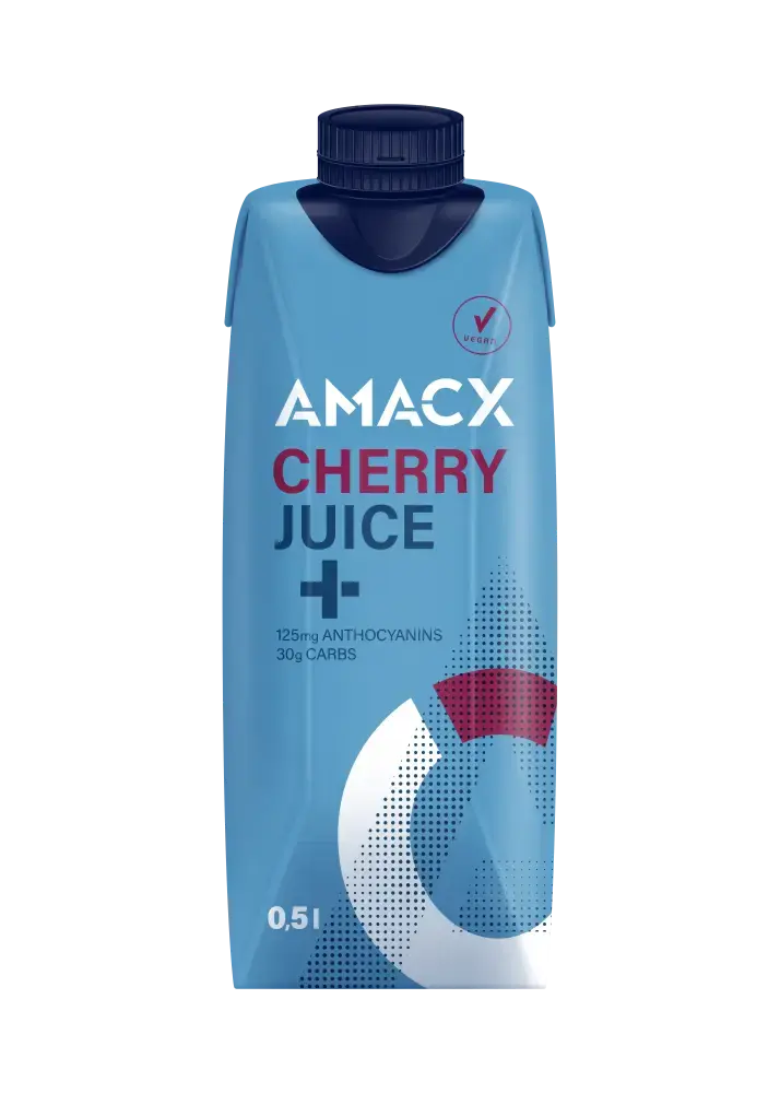 De Amacx Cherry Juice+ is een kant-en-klare drank die je eenvoudig direct na het sporten kunt innemen. Het sap bevat 125 mg anthocyanine uit zure kersen, een stof die van nature voorkomt in kersen en verantwoordelijk is voor hun dieprode kleur. Anthocyanen behoren tot de polyfenolen en staan bekend om hun krachtige antioxidatieve werking. Ze helpen bij het neutraliseren van vrije radicalen die ontstaan tijdens zware inspanningen. Hierdoor kan spierschade worden beperkt en het herstelproces worden versneld. Bovendien hebben studies aangetoond dat anthocyanen bijdragen aan het verminderen van spierpijn en ontstekingsreacties, wat het herstelcomfort na intensieve trainingen of wedstrijden aanzienlijk verhoogt. Dankzij de combinatie van 30 gram koolhydraten en 500 ml vocht ondersteunt het sap niet alleen het herstel op cellulair niveau, maar vult het ook effectief je energie- en vochtreserves aan. De zachte frisse smaak maakt het bovendien prettig om te drinken. Cherry Juice+ is NZVT-gekeurd en daardoor geschikt voor topsporters. Door het gemak en de zorgvuldige samenstelling is deze drank ideaal tijdens intensieve wedstrijdweken of ter voorbereiding op piekmomenten zoals meerdaagse wedstrijden.