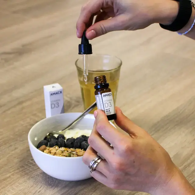Vitamine D speelt een belangrijke rol bij de botaanmaak, ondersteunt het immuunsysteem en zorgt voor een optimale werking van de hersenen en de spieren. Deze vitamine wordt door de huid aangemaakt onder invloed van zonlicht (mits er geen zonnebrand gebruikt is). Amacx Vitamine D3 25 mcg vult de tekorten aan. De gezondheidsraad adviseert daarom ook een dagelijkse aanvulling met een D3-supplement. Amacx Vitamine D3 druppels zijn voorzien van een NZVT certificaat, wat betekent dat de sporter de garantie heeft een dopingvrij supplement te gebruiken.