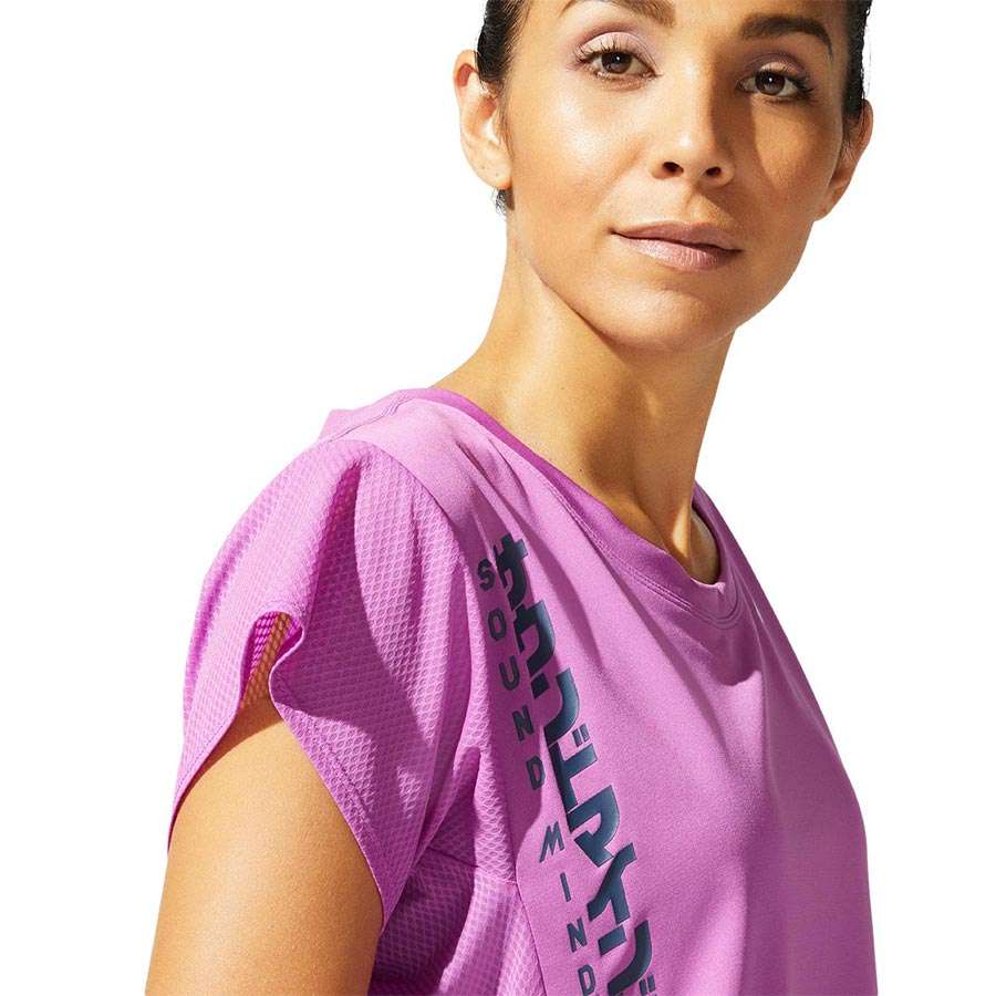 Dit Asics SMSB hardloopshirt is uniek in design en multifunctioneel inzetbaar vanwege de eigenschappen die het bezit. Allereerst valt natuurlijk de Japanse tekst op dit zich vertaalt naar "Sound Mind, Sound Body (SMSB), daarnaast is de voorzijde reflecterend. De materialen zijn duurzaam en sneldrogend. De achterzijde en de mouwen zijn gemaakt van mesh, wat zorgt voor extra ventilatie zodat je langer droog en fris blijft. Het ontwerp en de pasvorm lenen zich uitstekend voor de je looptrainingen, maar schroom niet dit shirt tijdens workouts en fitnesstrainingen te dragen. Of gewoon als sportief casual wanneer je langs het strand flaneert; daar is niks op tegen!