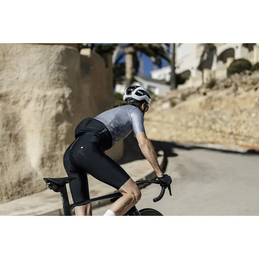 De Assos Equipe RS Schtradivari S11 Fietsbroek is ideaal voor in de zomer en lente. De Type.911-stof biedt lichte compressie voor spierondersteuning en is bijzonder slijtvast. Daarnaast heeft dit materiaal een hoog ademend vermogen. Dankzij de brede elastische banden aan de onderkant van de broekspijpen blijft de broek perfect op zijn plek zitten, hoe hard je ook fietst. De stevige, elastische bretels zitten comfortabel om je lichaam en de broek bevat een minimaal aantal naden voor optimaal draagcomfort. De RacingFit pasvorm voelt aan als een tweede huid en maakt deze broek ideaal voor de snelle ritten. Het zeer hoogwaardige S11 zeem zit vast met het GoldenGate principe van Assos en zorgt ervoor dat je urenlang comfortabel in het zadel zit.