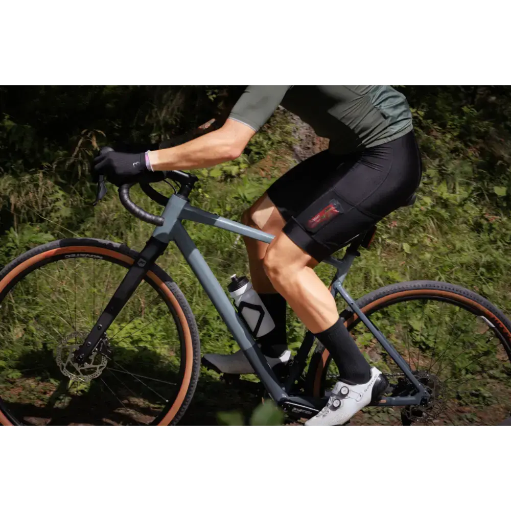 Drie mesh zakken aan de benen geven extra bagageruimte voor die lange bikepackingtochten