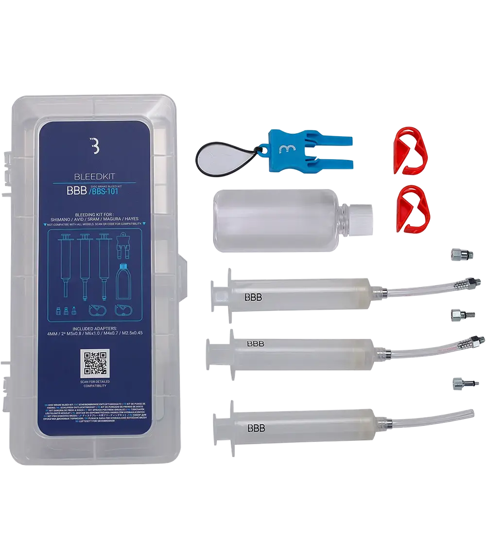 De BBB Cycling DiscBrake BBS-101 bleeding kit set bestaat uit drie injectiespuiten, een fles voor restolie, slangen, adapters en afsluiters. Dankzij deze set beschik je altijd over de juiste materialen om je schijfremmen optimaal te onderhouden en weer in topconditie te brengen voor optimaal remgedrag. De set is geschikt voor DOT en mineraal olie en het gereedschap kan overweg met Avid, Shimano, Magura, Hayes en SRAM systemen.