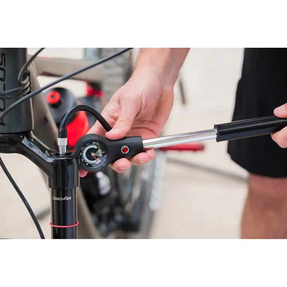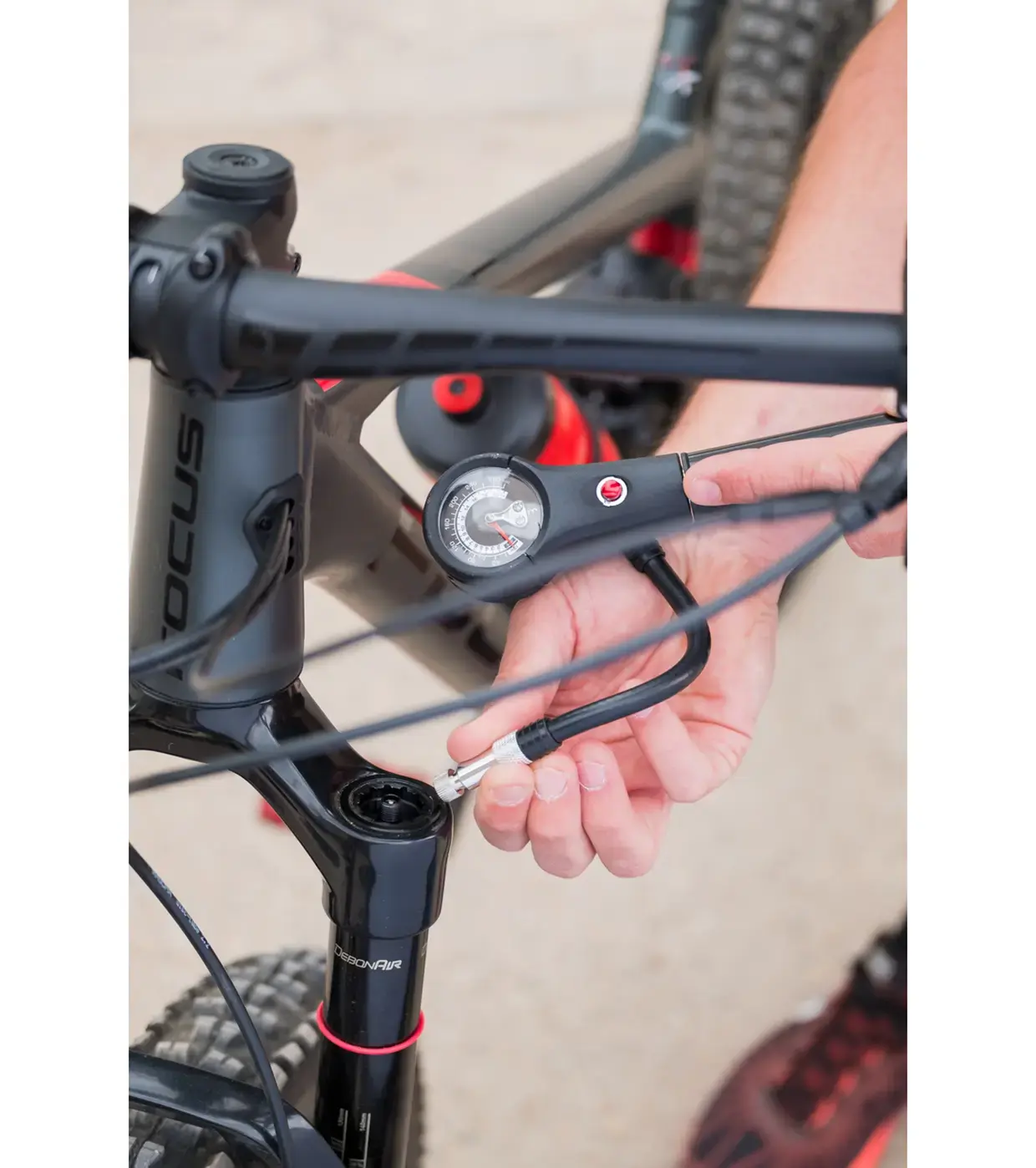 Puik pompie, multifunctioneel voor zowel voorvork, banden en fox frame vork Gebruik de pomp puur voor mtb en in rugzak is dit geen probleem