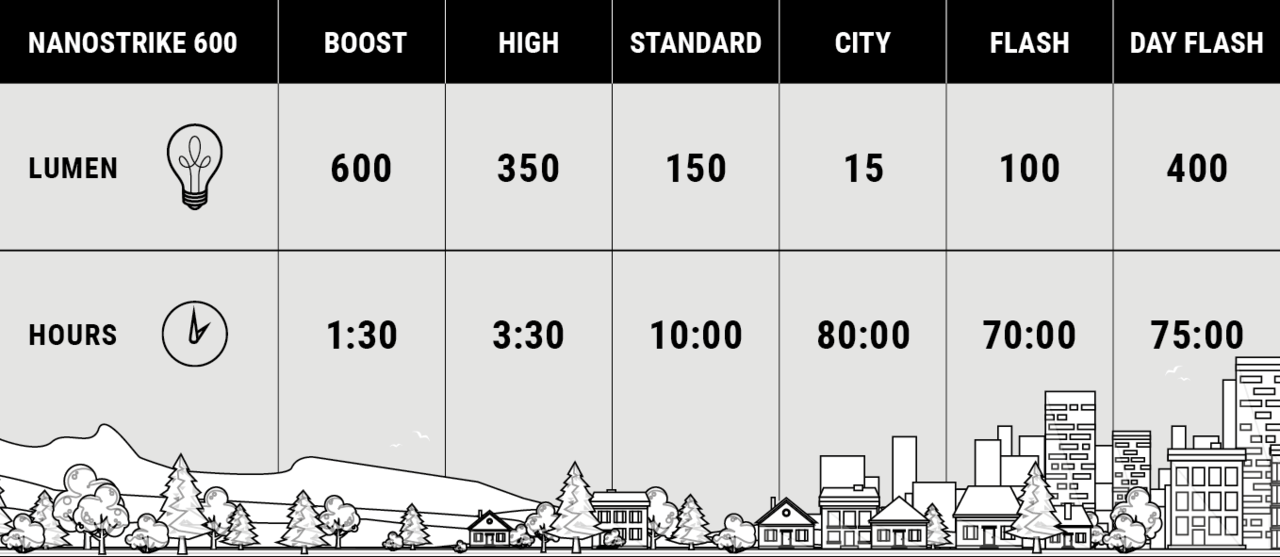 Mooi compact, goed design. Heeft 4 standen (zonder knipper). Ik fiets 's winters veel in het donker, ik gebruik stand 2: fel genoeg voor de donkerste paden. Bij mist is stand 4 soms heel handig.