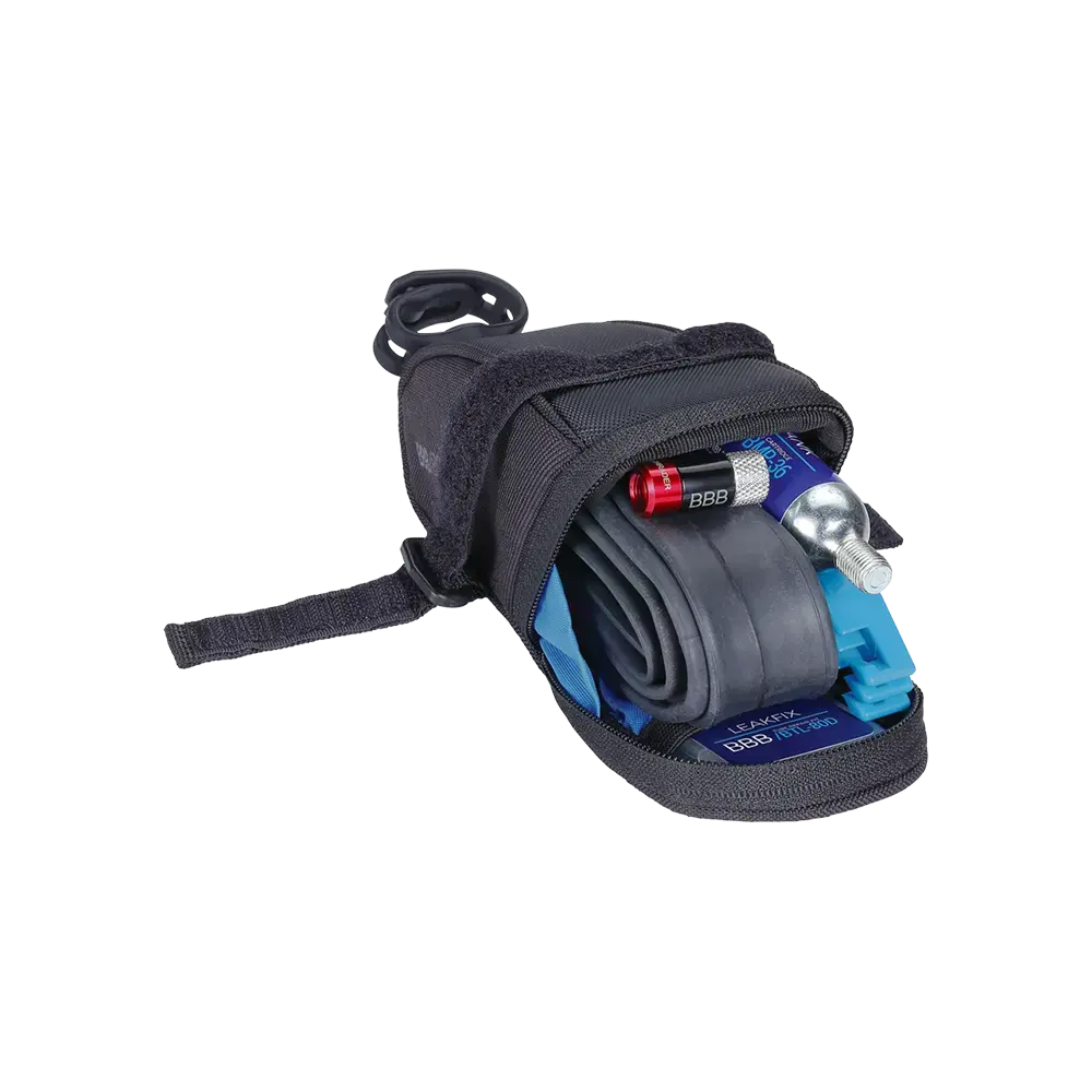 Dit tasje is precies groot genoeg voor een band, lichters en een tooltje en heeft een rubberbandje om vast te zetten ipv klittenband, waardoor je geen last hebt van een kapot schurende fietsbroek.