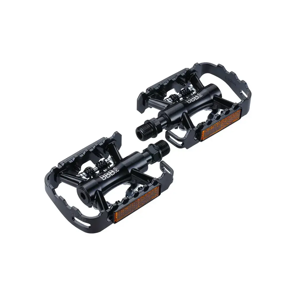 De DualChoice pedalen van BBB Cycling zijn superveelzijdig te gebruiken. De ene kant is een SPD-systeem waarmee je met schoenplaatjes kunt inklikken. De andere kant is een plat pedaal waarop je met gewone, platte schoenen kunt. Perfect als je nog niet precies weet met welk systeem je wilt fietsen. Daarnaast zijn deze pedalen populair bij fietsers die hun fiets gebruiken voor zowel woon-werkverkeer als sport. Naar je werk fiets je met platte schoenen en in het weekend neem je jouw mountainbike mee op de trails. De pedalen hoef je nooit te wisselen! Om die reden zijn er ook reflectoren aangebracht, perfect als je ’s ochtends vroeg of ’s avonds op de fiets zit in het verkeer.