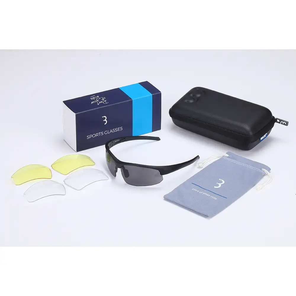 Voordelige maar complete en lichtgewicht Impress BSG-58T Sportbril van BBB Cycling. Met donkere, 100% blokkerende lenzen en een opberghoesje. De bril is voorzien van een sterk montuur met flexibele brilpoten en een comfortabel rubberen neusstuk. Deze kenmerken zorgen voor een optimale pasvorm. De Impress wordt geleverd met een extra setje transparante en gele lenzen. Deze lenzen bieden 100% UV-bescherming en bescherming tegen weersinvloeden, stof/zand en insecten. Bij de T-variant wordt een hardcase meegeleverd.