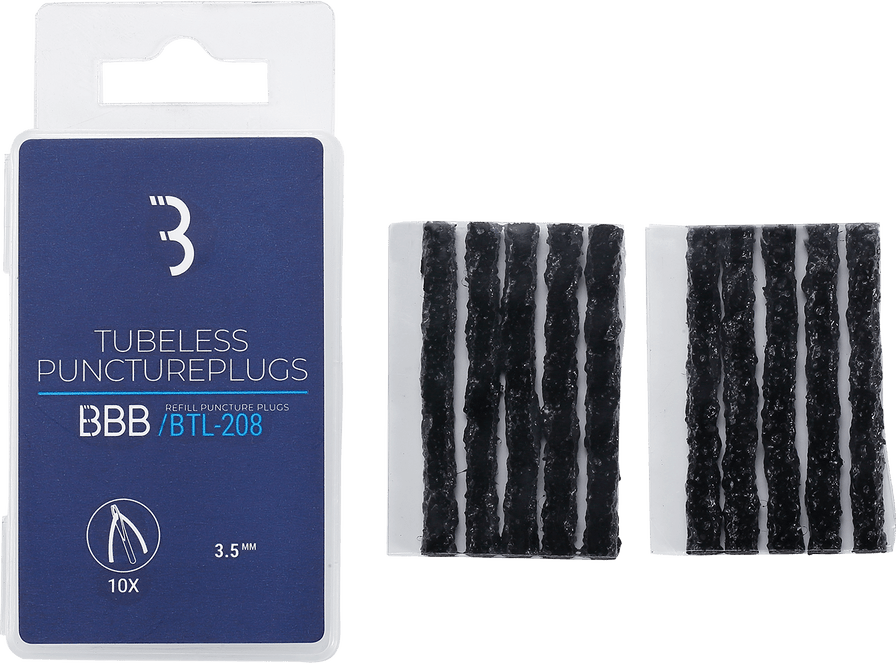 Met de BBB PuncturePlugs BTL-208 sta je nooit lang stil na een lekke band. Deze set bevat 10 tubeless pluggen in twee maten (1,5 mm en 3,5 mm) voor een snelle en betrouwbare reparatie van tubeless banden, zowel op de weg als offroad. De pluggen zijn compatibel met de BBB PuncturePlugger (BTL-185), MaxiFold Tubeless (BTL-141TL) en BarPlugger (BTL-210), en worden geleverd in een compacte kunststof opbergdoos. Geen gedoe meer met het verwisselen van binnenbanden, duw er gewoon een plug in, dan wat lucht en je bent weer klaar om te gaan!