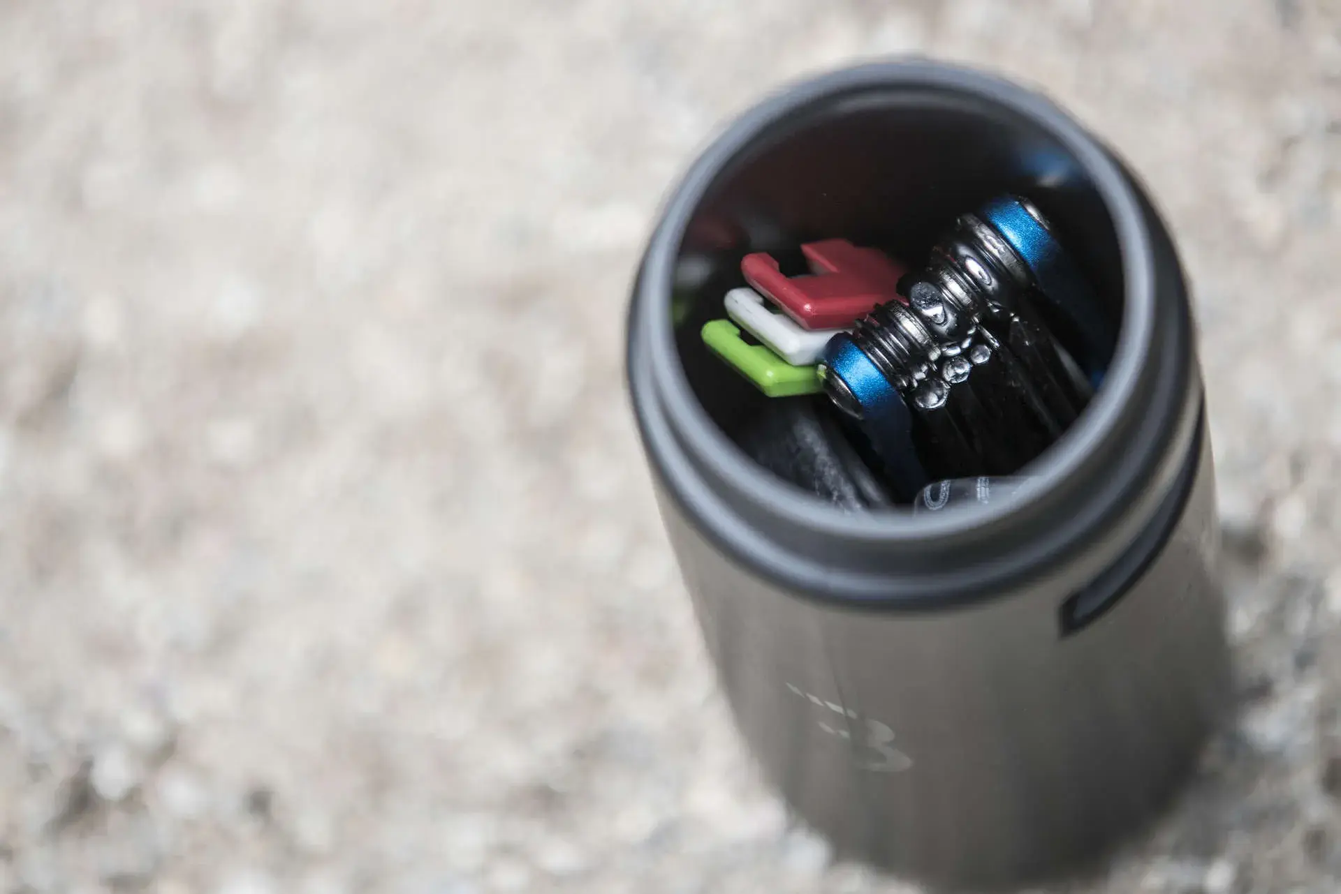 Ruimte genoeg voor een binnenband en multitool. In de dop extra ruimte voor een huissleutel, geld of iets anders kleins. Dit kan je afsluiten met een dop. Ik gebruik geen zadeltasje meer alleen nog deze bidon. Ook pas mn personeelspas en rijbewijs hier makkelijk in.