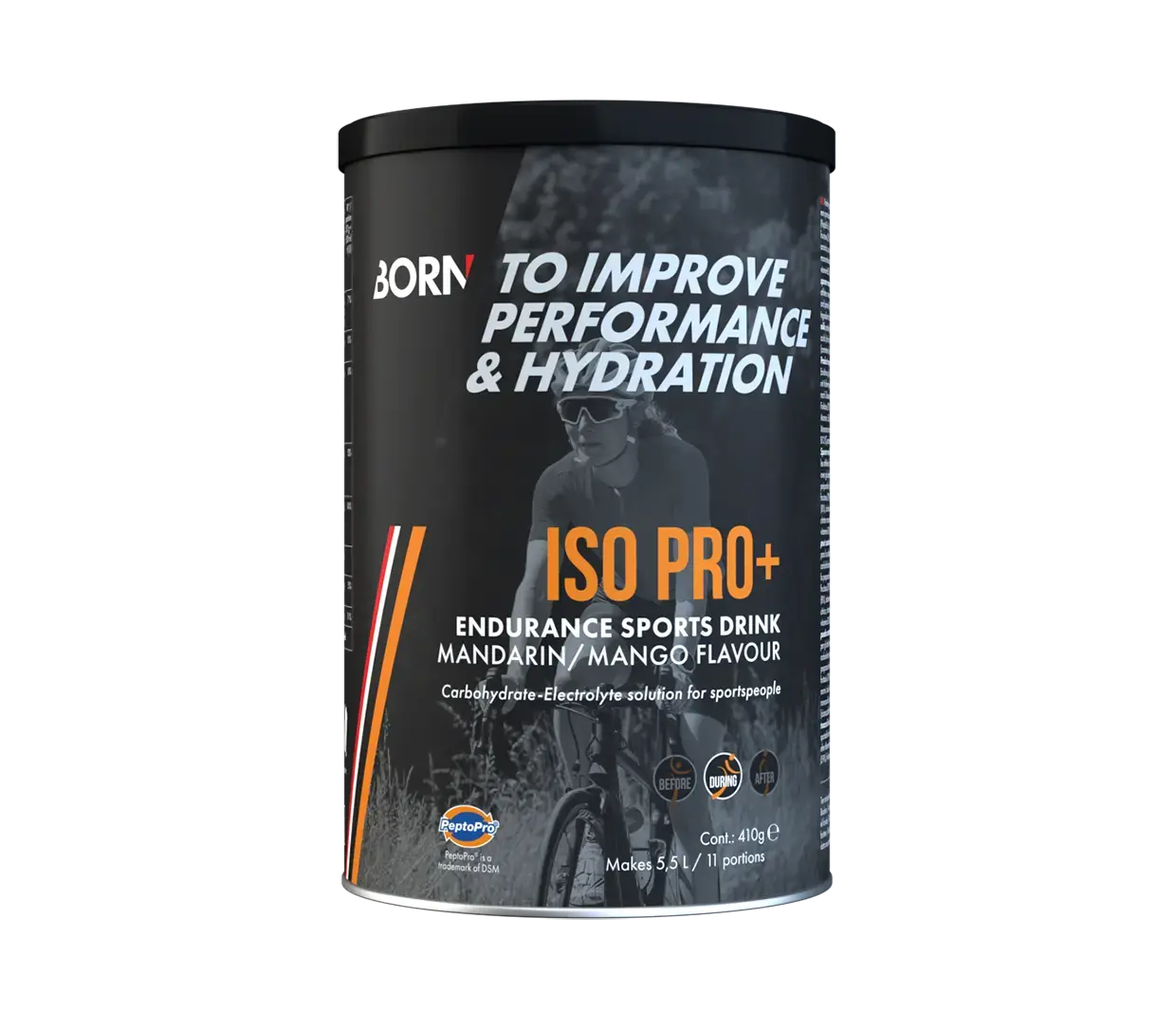 De Iso Pro+ energiegevende dorstlesser van Born heeft toegevoegde mineralen voor het op peil houden van je energie- en vochtbalans. De Born ISO PRO heeft een verfrissende mandarijn/mango smaak en levert een snelle energieopname door de 2:1 verhouding van Glucose / Fructose. Tijdens een inspanning verbrand je namelijk koolhydraten. Daarnaast treedt verlies van vocht en mineralen op. Dit heeft een effect op jouw prestatie: vochtverlies van 2% van je lichaamsgewicht kan resulteren in een vermindering van prestaties met 10%! Het aanvullen van mineralen en vocht is daarom erg belangrijk. Als je BORN ISO PRO+ drinkt, voorkom je verlies van prestatieniveau en houd je jouw vochtbalans op peil. Daarnaast worden belangrijke koolhydraten, mineralen en vocht aangevoerd. De toegevoegde PeptoPRO zorgt ervoor dat je sneller kan herstellen na en zelfs tijdens de inspanning. PeptoPRO zijn deels afgebroken eiwitten waardoor ze zeer snel worden opgenomen en ook minder belastend zijn voor je maag. Hiervoor is nauw samengewerkt met de renners en stafleden voor een optimaal resultaat. Deze sportdrank is het meest ideaal in een situatie waarin veel inspanningen in een korte tijdsspanne moeten worden geleverd. Zoals bijvoorbeeld een fietsvakantie of een trainingsweekend. Doordat je spieren sneller kunnen beschikken over de eiwitten zijn deze namelijk beter hersteld bij de volgende inspanning.