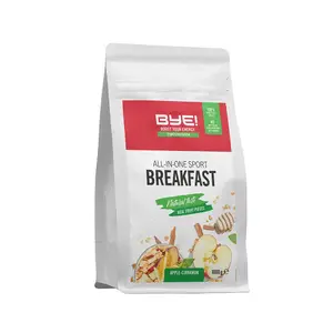 Het BYE! All-in-one ontbijt is een ideaal ontbijt voor een ieder die een sportieve dag tegemoet gaat. De muesli zit boordevol geroosterde havermout vlokken, noten, zaden, gedroogd fruit en eiwitten. Het All-in-one ontbijt heeft muesli een hoog eiwitgehalte van 15 gram per 100 gram muesli en tegelijkertijd een hoog vezelgehalte. Dit maakt het ontbijt ook zeer geschikt voor het gebruik na een training of als tussendoortje tijdens periodes waarin weel inspanningen gedaan worden. Er zijn geen suikers toegevoegd. Ook bevat het ontbijt geen kunstmatige kleurstoffen, smaakstoffen of conserveermiddelen. In plaats daarvan bevat het echt fruit en natuurlijke zoetstoffen als kaneel, appelpoeder en stevia.