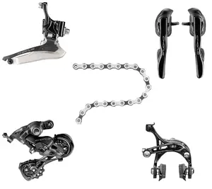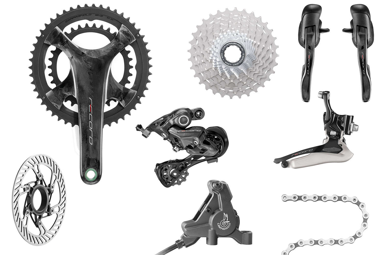 De Campagnolo Record Disc Race Groepset is het beste wat er te krijgen is op dit gebied in een stijlvol jasje! De groepset is volledig gemaakt van alleen maar hoogwaardige materialen als carbon en titanium. Die materialen zorgen er ook voor dat de groepset heel erg lang mee gaat. De prijs ligt per onderdeel misschien wat hoger, maar als je onderdelen goed onderhoud, gaan ze ook veel langer mee dan concurrenten. De kettingbladen, ketting en cassette zijn zo vormgegeven, dat ze heel soepel en snel schakelen. Deze groepset maakt gebruik van schijfremmen, waardoor je in alle omstandigheden bent verzekerd van goede remprestaties. De speciale rotors zorgen ervoor dat deze tegen hoge temperaturen kunnen, maar ook snel afkoelen in bijvoorbeeld een lange afdeling. In de remklauw zitten magneten om de remblokken na het inknijpen weer uit elkaar te krijgen. Daardoor is dit niet aan slijtage onderhevig zoals een veer dat bijvoorbeeld wel zou zijn.