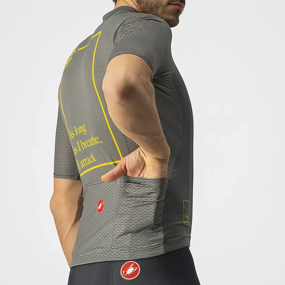 Het Castelli Breathe Attack fietsshirt is gemaakt voor aanvallers! Op de achterzijde staat dan ook de quote: As long as I Breathe, I Attack! Het shirt voert je zweet dan ook snel af, zodat jij je op je rit kan focussen. De pasvorm is mooi aansluitend en vormt zich naar je lichaam. De gebruikte stoffen pakken zweet zo snel op en voeren het af. Een mesh op de zijkanten helpt daar alleen maar bij. Op de achterzijde zitten drie insteekzakken die lekker ruim zijn, voor alles wat je nodig hebt tijdens je rit.