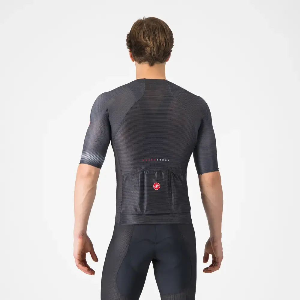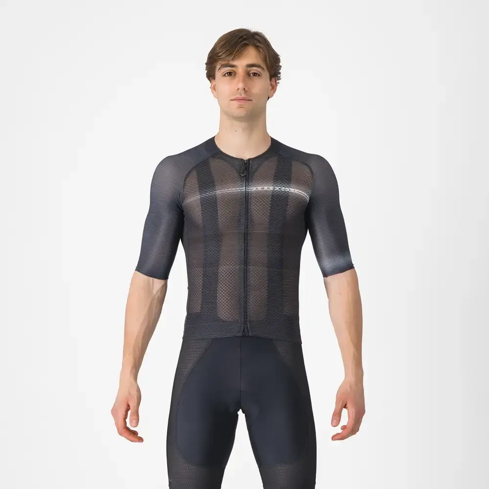 De Castelli Climber's A/C Fietsshirt Korte Mouwen Heren is speciaal ontwikkeld voor de warmste dagen in het hooggebergte en zomerse ritten waarin aerodynamica nog steeds cruciaal is. Dit shirt is gebaseerd op de feedback van profrenners die op zoek waren naar een jersey die maximale ventilatie biedt zonder afbreuk te doen aan snelheid.De constructie maakt gebruik van CFD-geoptimaliseerde naden en de technische Flusso 3D-stof aan de voorkant, die zorgt voor een snelle afvoer van warmte en zweet. De StradaPro 3D-rug biedt niet alleen uitstekende ventilatie, maar blokkeert ook meer dan 90% van de UV-stralen. De stretchmouwen reiken tot aan de elleboog en hebben onafgewerkte randen voor een aerodynamische pasvorm zonder drukpunten. Dankzij het elastiek rondom de taille blijft het shirt goed op zijn plek, zelfs bij volle achterzakken. De YKK® Vislon®-ritssluiting maakt het eenvoudig om de ventilatie tijdens de rit aan te passen. Dit fietsshirt is perfect voor lange zomerritten, snelle trainingssessies of intensieve beklimmingen in de bergen.