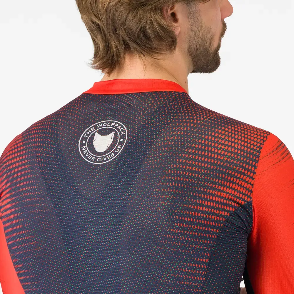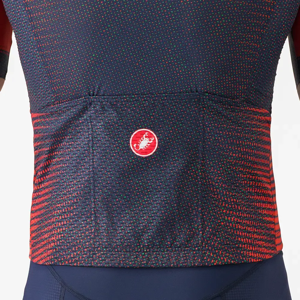 Het befaamde Competizione fietsshirt is er nu met een nieuw opvallend design! Het Castelli Competizione 3 Landismo Fietsshirt Korte Mouwen Heren is een veelzijdige allround jersey die perfect is voor zowel ontspannen trainingsritten als snelle groepsritten. Het Strada micromesh op de voor- en achterkant en de mouwen zorgt voor uitstekende ventilatie en vochtregulatie, zodat je koel en droog blijft tijdens je ritten. Dankzij de rekbare Tailwind-stretchstof op de zijpanelen en zakken heeft het shirt een aansluitende, aerodynamische pasvorm. Het anatomische ontwerp met zijpanelen die naar achteren wikkelen, draagt bij aan een perfecte pasvorm. De YKK® Vislon®-ritssluiting over de hele lengte maakt het eenvoudig om de ventilatie aan te passen, terwijl het siliconen gripelastiek in de taille voorkomt dat de jersey omhoog kruipt, zelfs met volle achterzakken. De drie achterzakken bieden voldoende opbergruimte en zijn strategisch geplaatst voor gemakkelijke toegang tijdens het fietsen. Of je nu traint of deelneemt aan een race, dit shirt biedt zowel comfort als snelheid, zodat je altijd klaar bent voor de volgende rit.