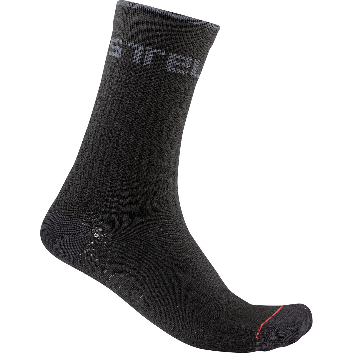 De super comfortabele Castelli Distanza 20 fietssokken zijn super ademend en licht van gewicht dankzij het hoogwaardige Merinowol. Warmte wordt snel afgevoerd en de sokken blijven goed droog. De stretch band om de middenvoet zorgt voor een goede ondersteuning van de voetboog.