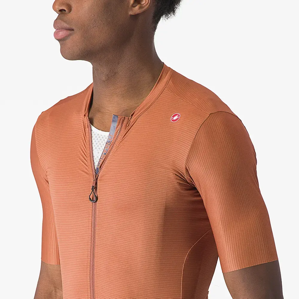 Heerlijk licht en luchtig fietsshirt van Castelli. Prachtige kleur in iets glimmende stof. Sluit goed aan op het lichaam. Heb de xxl besteld, ben 1.94 cm lang, 98 kilo. Maattabel klopt. Luxe shirt met handig ritsje. Fijne wat bredere zoom aan de onderkant. Lang shirt wat goed past bij lager uitgesneden fietsbroeken van Assos.
