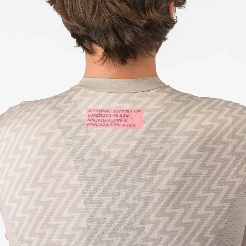 Het Castelli #GIRO Colle Delle Finestre Fietsshirt Korte Mouwen verwijst naar de legendarische Alpen col “Colle Delle Finestre” die de renners tijdens etappe 20 zullen bedwingen. Het is de ideale allround jersey voor al je ritten. Dit shirt biedt zowel comfort tijdens trainingsritten als snelheid tijdens snelle groepsritten of wedstrijden. De pasvorm is iets minder strak dan bij racegerichte modellen, maar de gebruikte stoffen zijn rekbaar genoeg om goed aan te sluiten bij verschillende lichaamsvormen. Het Strada micromesh op de voor- en achterkant en de mouwen zorgt voor optimale ventilatie en helpt je koel en droog te blijven tijdens inspannende ritten. De Tailwind stretchstof op de zijpanelen en zakken zorgt voor een aerodynamische pasvorm en voldoende flexibiliteit. Het anatomische ontwerp met zijpanelen die naar achteren wikkelen, draagt bij aan de perfecte pasvorm. Dankzij de YKK® Vislon®-ritssluiting over de hele lengte is de jersey eenvoudig te openen en te sluiten, ideaal voor snelle ventilatie op warme dagen. Het siliconen gripelastiek in de taille voorkomt dat het shirt omhoog kruipt, zelfs bij volle achterzakken. De drie achterzakken zijn ruim genoeg voor alles wat je nodig hebt tijdens lange ritten.Dit wordt je go-to jersey als je stijlvol de stad uit wilt en optimaal wilt genieten van zowel comfort als prestaties.