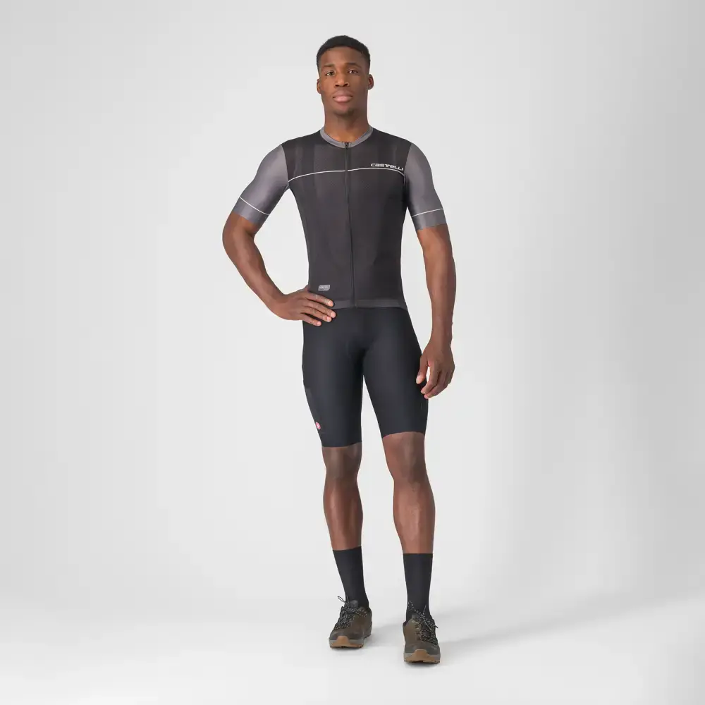 De Castelli Unlimited 2 Fietsshirt Korte Mouwen Heren is speciaal ontworpen voor lange dagen op de fiets, ongeacht het terrein. Dit shirt biedt alle prestaties die je nodig hebt zonder de strakke pasvorm van een aerodynamische racejersey. Dankzij de Strada micromesh-stof geniet je van uitstekende ventilatie en vochtregulatie, terwijl de lichte stretch zorgt voor een comfortabele pasvorm.De pasvorm van de Unlimited 2 Jersey is iets ruimer dan die van een traditionele wegjersey, waardoor je meer bewegingsvrijheid hebt tijdens lange ritten. Drie ruime achterzakken bieden voldoende opbergruimte voor voeding en accessoires, terwijl een veiligheidszakje met rits je sleutels of betaalpas veilig houdt. Het elastiek aan de taille helpt niet alleen om de jersey op zijn plaats te houden, maar ondersteunt ook het extra gewicht in de zakken.Dankzij de YKK® Vislon®-ritssluiting over de hele lengte kun je eenvoudig ventilatie aanpassen tijdens warme ritten. Of je nu op avontuur gaat op gravelpaden of lange dagen op de weg doorbrengt, dit fietsshirt biedt alles wat je nodig hebt om je volledig te kunnen concentreren op de rit.