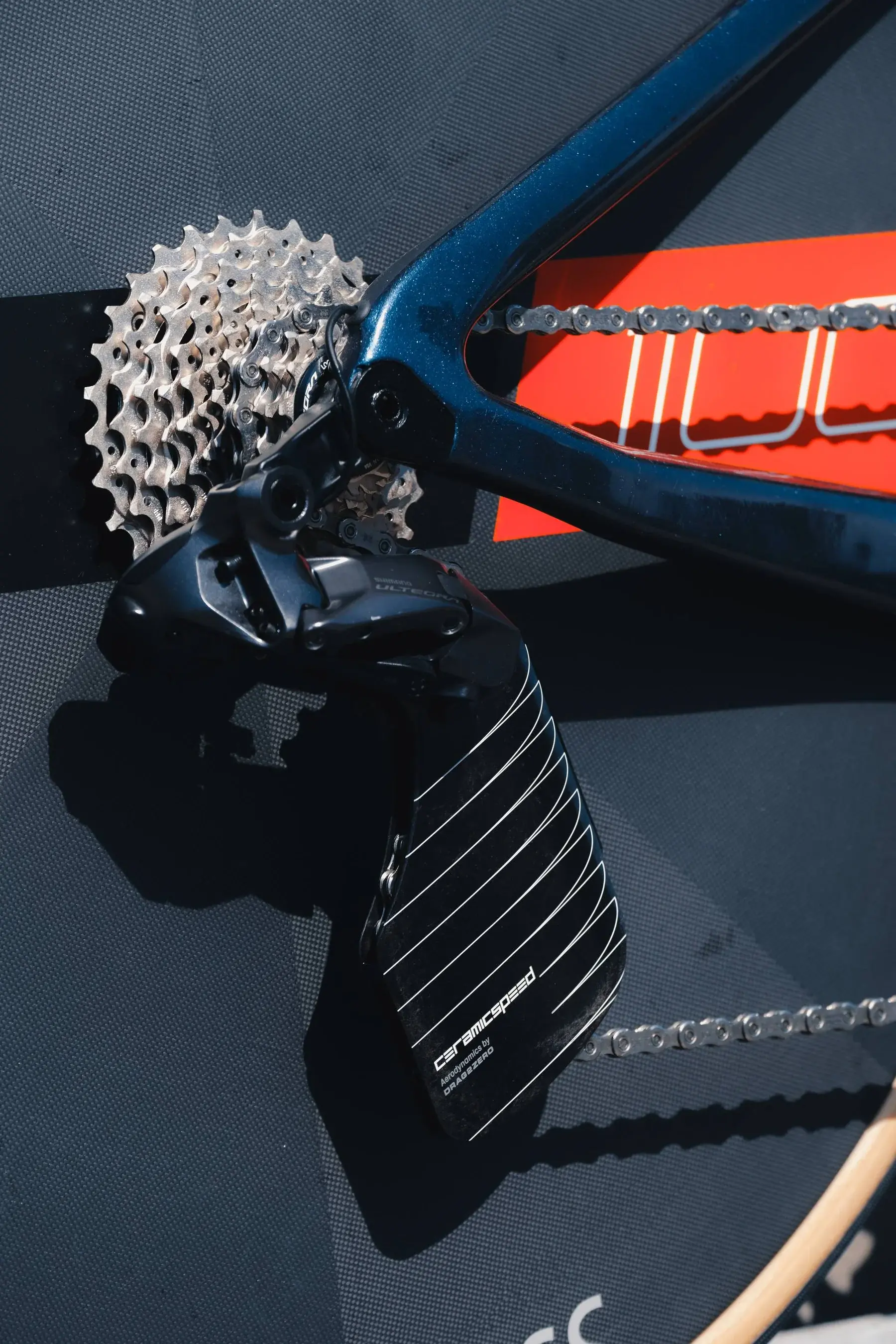 De CeramicSpeed OSPW Aero ALPHA Derailleurkooi voor Shimano Dura-Ace RD-9250 en Ultegra RD-8150 is de nieuwste versie van de snelste aerodynamische derailleurkooi, nu voorzien van de gepatenteerde ADR-lagerbescherming en stille ALPHA-discs met composiet tandprofiel. Deze derailleurkooi reduceert de luchtweerstand van de achterderailleur met maximaal 60% en vermindert de wrijving met 35-40% ten opzichte van standaard kettingwieltjes. Het ontwerp is niet alleen aerodynamisch, maar ook structureel versterkt. De kettingwieltjes, kooien en lagers worden met de hand geproduceerd en gemonteerd in Denemarken.
