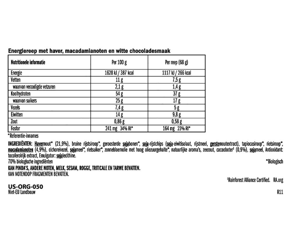 In de Clif Bar White Chocolate Macadamia sportrepen ontmoeten geroosterde macadamianoten de smaak van romige witte chocolade voor een heerlijke voedzame finish. Deze blijf je eten op de fiets! De plantaardige reep is een bron van zowel vetten, koolhydraten en 9 gram eiwitten. Perfect als tussendoortje of voor de nodige energie tijdens het fietsen.