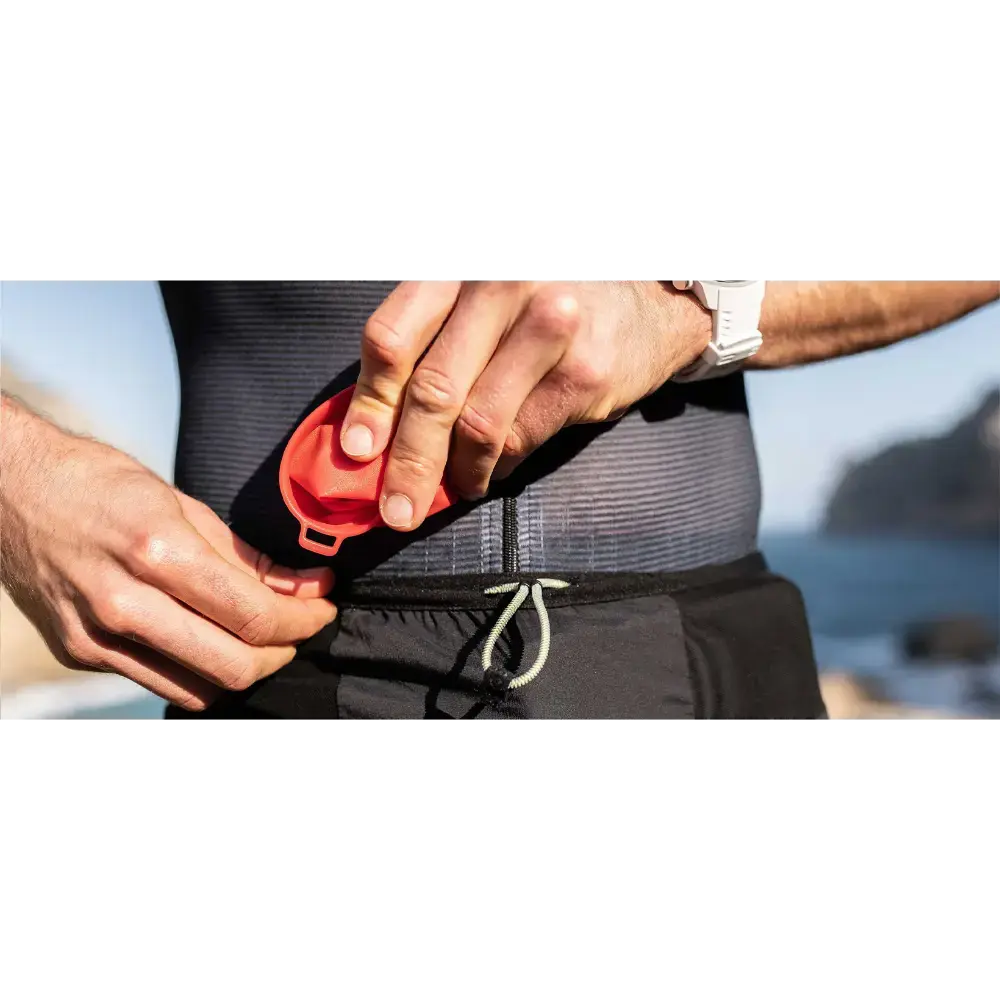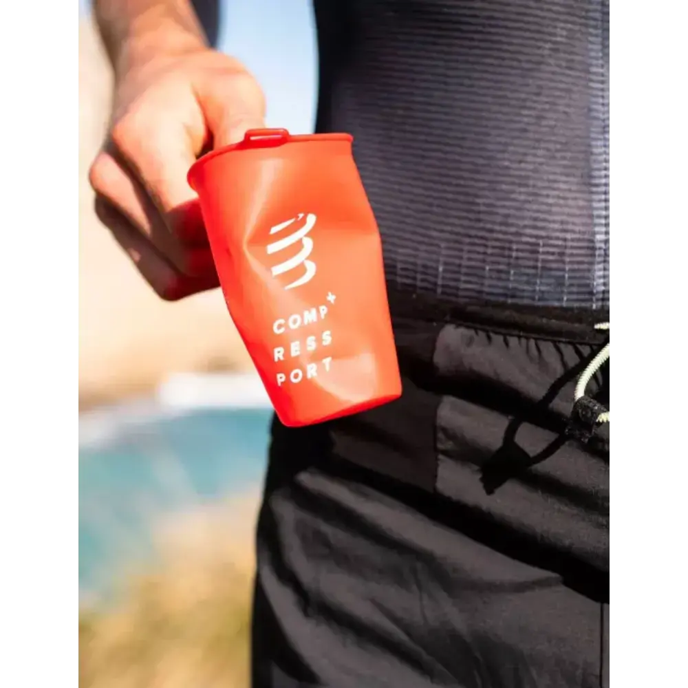 De tijd van plastic bekers die na elke bevoorradingspost in de natuur achterbleven, is voorbij. De opvouwbare Fast Cup van Compressport is een must-have en zelfs een eis bij veel ultra-trails om afval te verminderen. Deze zachte, vederlichte drinkbeker is extreem duurzaam, weegt slechts 8 gram en heeft een totale inhoud van 200 ml. De stevige rand en een ergonomische duimlus bieden extra stabiliteit, zodat je de beker makkelijk vult en zonder te morsen kunt drinken tijdens het hardlopen. Hij is hittebestendig en dus geschikt voor zowel warme als koude dranken. Bovendien is de cup 100% BPA- en PVC-vrij, eenvoudig te reinigen en zelfs vaatwasserbestendig. Klem hem aan je tas voor snelle toegang, of vouw hem op en berg hem op in een zak van je vest of riem. De Fast Cup is je praktische en duurzame partner voor milieuvriendelijk drinken tijdens elke race.