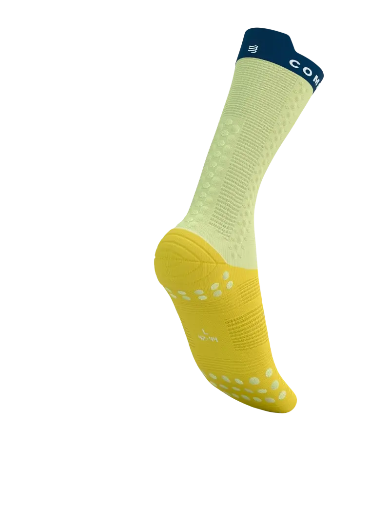Met de Pro Racing v4.0 lijn komt Compressport met de vierde generatie van deze populaire Pro Racing compressiesokken. Deze nieuwe lijn biedt nog meer comfort en ventilatie ten opzichte van zijn voorganger. De Pro Racing Compressiesok is speciaal bedoeld voor sporters die hun voeten wat extra comfort willen geven en de spieren positief willen stimuleren bij de prestatie. De combinatie van 3D.DOTS en FLAT.DOTS zorgen voor slipvaste ondersteuning, optimale demping en een uitstekend vochttransport. De masserende werking aan de onderzijde van de voet stimuleert de bloedsomloop waardoor de voet meer zuurstof kan opnemen. De sokken beperken hiermee de kans op blessures, spierpijn of kramp en zorgen dat de spieren sneller kunnen herstellen. Tevens biedt de sok extra ondersteuning aan de enkel, voetboog en achillespees en absorbeert deze schokken en trillingen die schadelijk kunnen zijn voor pezen, spieren en gewrichten. Bovendien zijn deze fietssokken hoger uitgevoerd dan de hardloopsokken van Compressport. Zo worden de kuitspieren optimaal ondersteund en kun jij gesoigneerd voor de dag komen in het peloton of bij de koffiestop!