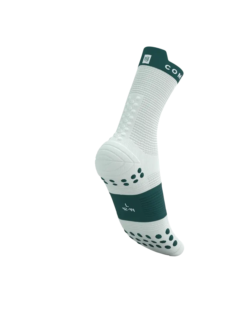 Met de Pro Racing v4.0 lijn komt Compressport met de vierde generatie van deze populaire Pro Racing compressiesokken. Deze nieuwe lijn biedt nog meer comfort en ventilatie ten opzichte van zijn voorganger. De Pro Racing Compressiesok is speciaal bedoeld voor sporters die hun voeten wat extra comfort willen geven en de spieren positief willen stimuleren bij de prestatie. De combinatie van 3D.DOTS en FLAT.DOTS zorgen voor slipvaste ondersteuning, optimale demping en een uitstekend vochttransport. De masserende werking aan de onderzijde van de voet stimuleert de bloedsomloop waardoor de voet meer zuurstof kan opnemen. De sokken beperken hiermee de kans op blessures, spierpijn of kramp en zorgen dat de spieren sneller kunnen herstellen. Tevens biedt de sok extra ondersteuning aan de enkel, voetboog en achillespees en absorbeert deze schokken en trillingen die schadelijk kunnen zijn voor pezen, spieren en gewrichten.