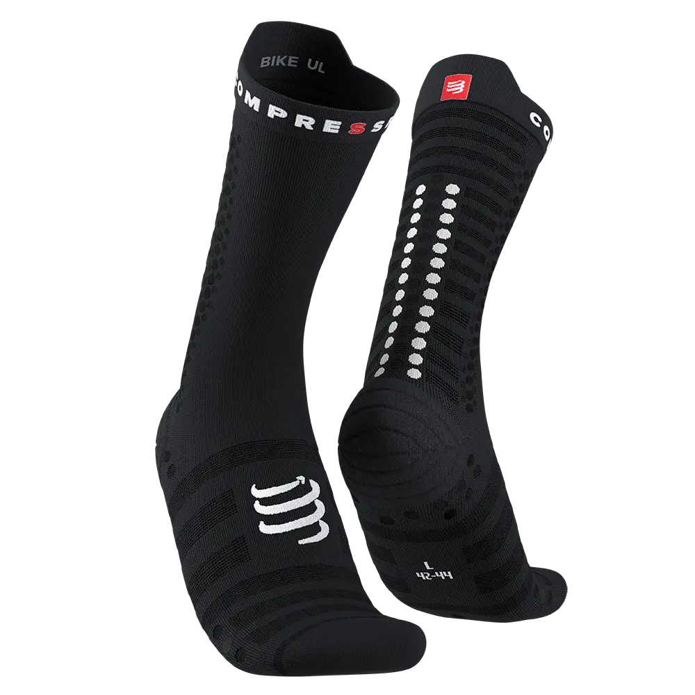 Met de Pro Racing v4.0 Ultralight Bike lijn komt Compressport met de volgende generatie van deze populaire Pro Racing compressiesokken. Deze nieuwe lijn biedt nog meer comfort en ventilatie ten opzichte van zijn voorganger. De Pro Racing Compressiesok is speciaal bedoeld voor sporters die hun voeten wat extra comfort willen geven en de spieren positief willen stimuleren bij de prestatie. De combinatie van 3D.DOTS en FLAT.DOTS zorgen voor slipvaste ondersteuning, optimale demping en een uitstekend vochttransport. De masserende werking aan de onderzijde van de voet stimuleert de bloedsomloop waardoor de voet meer zuurstof kan opnemen. De sokken beperken hiermee de kans op blessures, spierpijn of kramp en zorgen dat de spieren sneller kunnen herstellen. Tevens biedt de sok extra ondersteuning aan de enkel, voetboog en achillespees en absorbeert deze schokken en trillingen die schadelijk kunnen zijn voor pezen, spieren en gewrichten. Bovendien zijn deze fietssokken hoger uitgevoerd dan de hardloopsokken van Compressport. Zo worden de kuitspieren optimaal ondersteund en kun jij gesoigneerd voor de dag komen in het peloton of bij de koffiestop!