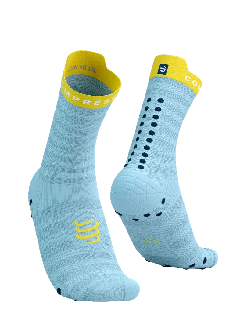 Met de Pro Racing v4.0 lijn komt Compressport met de vierde generatie van deze populaire Pro Racing compressiesokken. Deze nieuwe lijn biedt nog meer comfort en ventilatie ten opzichte van zijn voorganger. De Pro Racing Compressiesok is speciaal bedoeld voor sporters die hun voeten wat extra comfort willen geven en de spieren positief willen stimuleren bij de prestatie. De combinatie van 3D.DOTS en FLAT.DOTS zorgen voor slipvaste ondersteuning, optimale demping en een uitstekend vochttransport. De masserende werking aan de onderzijde van de voet stimuleert de bloedsomloop waardoor de voet meer zuurstof kan opnemen. De sokken beperken hiermee de kans op blessures, spierpijn of kramp en zorgen dat de spieren sneller kunnen herstellen. Tevens biedt de sok extra ondersteuning aan de enkel, voetboog en achillespees en absorbeert deze schokken en trillingen die schadelijk kunnen zijn voor pezen, spieren en gewrichten. Deze Ultralight variant is doorontwikkeld vanuit de wielersport waar iedere gram er 1 teveel is. Ze zijn zo’n 25% lichter dat de standaard sokken van Compressport. Met deze Ultralights ben je klaar voor iedere race in warmere omstandigheden!