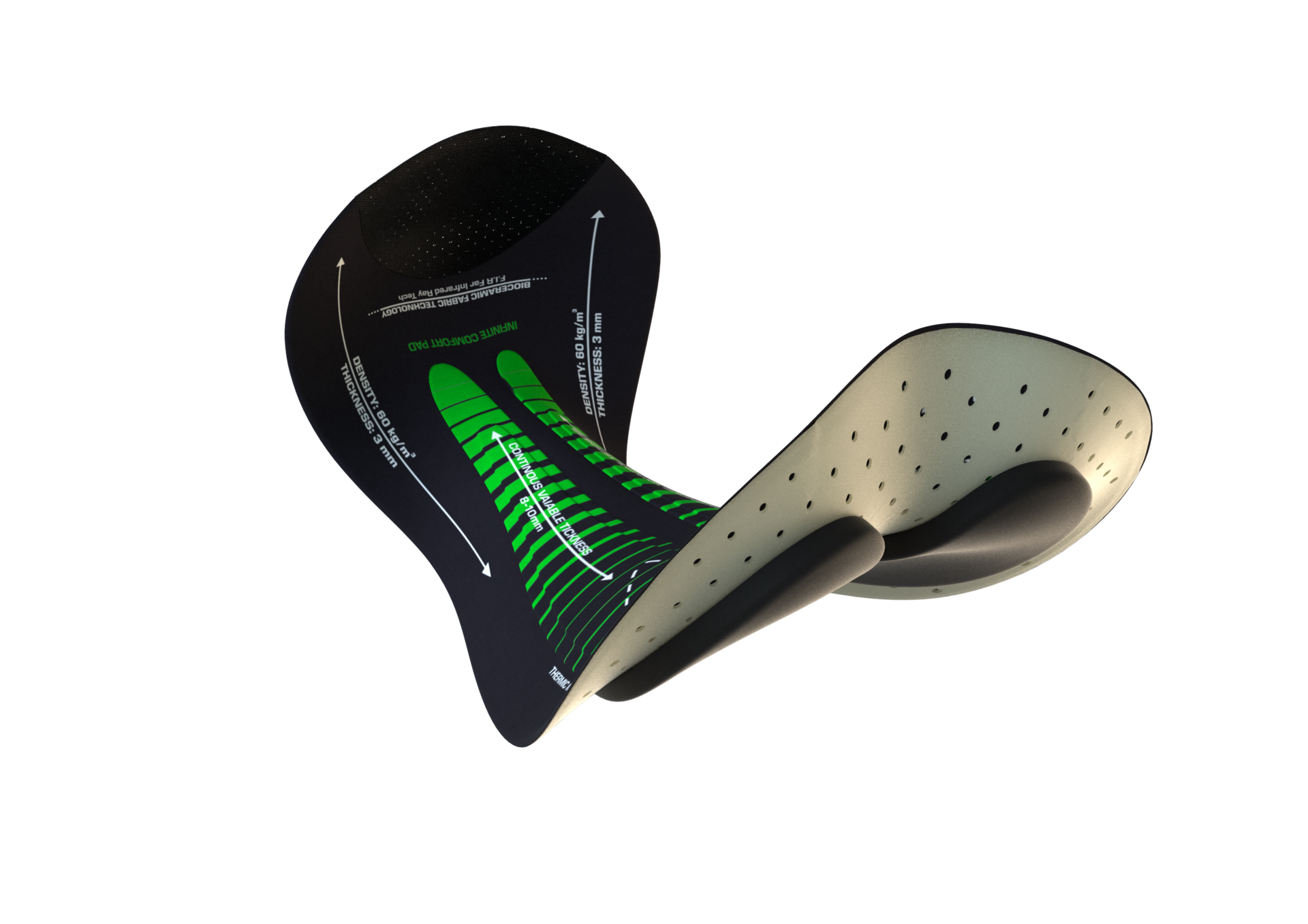 Dankzij het gebruik van bio-keramische materialen kent dit zeem een zeer sterke temperatuurregulatie. De zeem is voorzien van ventilatiegaatjes en elastisch mesh materiaal. Dit maakt dat de zeem een hoog ademend vermogen heeft. De zeem is relatief dik (zitgedeelte 14 mm, middenstuk 8 mm en buitenrand 4 mm) en is daarmee uitermate geschikt voor de intensievere fietser die graag lange fietstochten maakt.