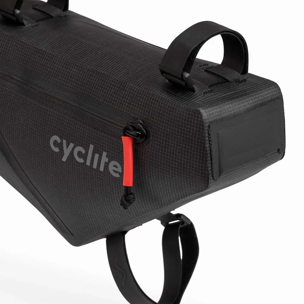 De Cyclite Frametas 2.8L is een veelzijdige, allround frametas die verrassend veel uitrusting kan bergen. Met twee waterdichte ritssluitingen krijg je toegang tot een plat vak aan de linkerkant, ideaal voor documenten, geld of andere platte spullen, en een ruim hoofdcompartiment aan de rechterkant. Binnenin vind je twee mesh vakjes voor kleine spullen en een sleutelhaak voor extra gemak. Aan de voorzijde zit een afgedekte opening, waardoor je eenvoudig kabels voor GPS, verlichting, telefoon of een drinkslang kunt doorvoeren.