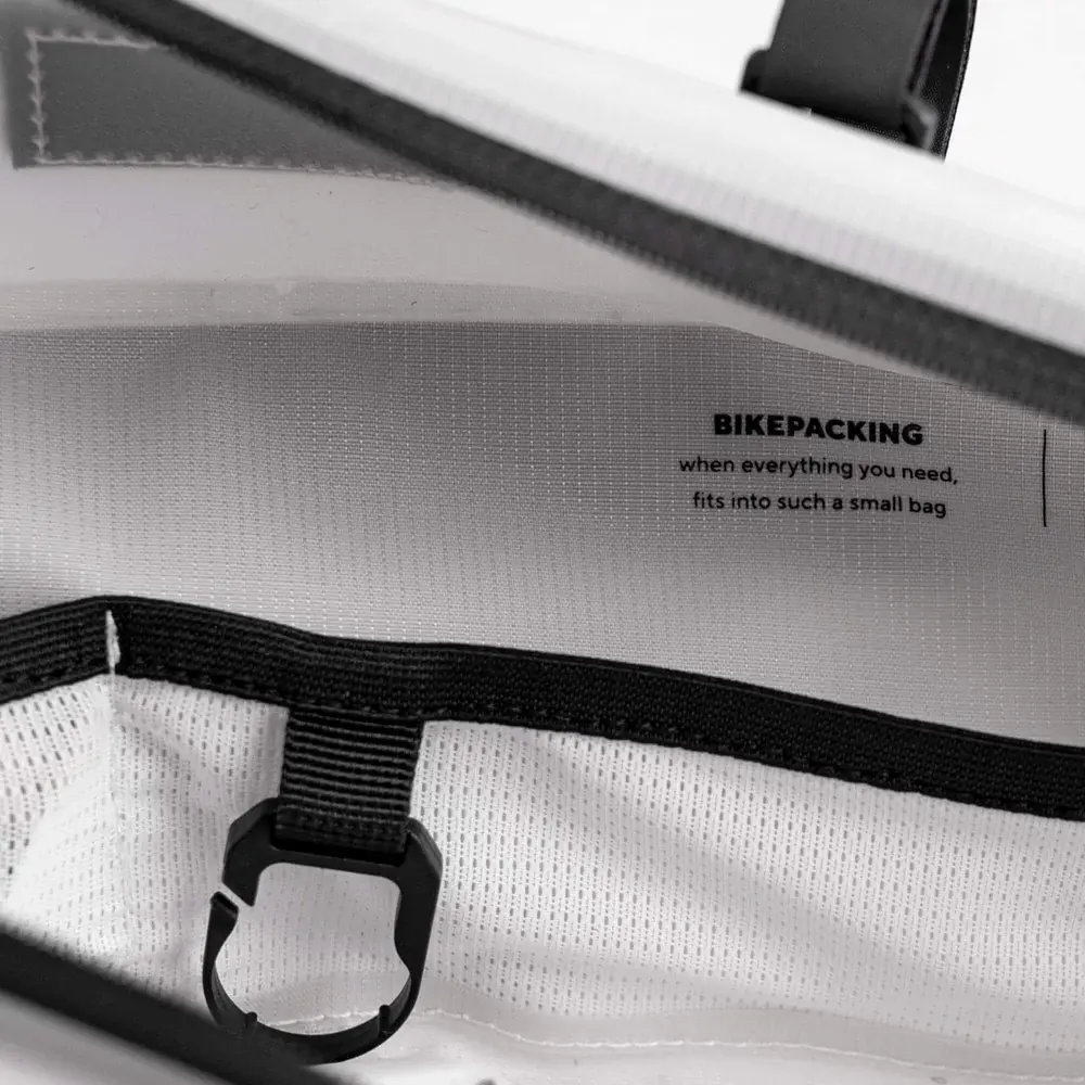 De tas is verdeeld in twee grote compartimenten, één boven en één onder, en beschikt daarnaast over een extra zijvak voor pasjes, ID of contant geld. Binnenin vind je twee mesh vakjes voor kleine spullen en een sleutelhaak. Aan de voorzijde is een afgedekte opening aanwezig voor het doorvoeren van stroomkabels of een drinkslang. Ondanks het grote volume en de vele functionaliteiten is de Frametas Large extreem licht van gewicht, wat hem perfect maakt voor langere avonturen of ultra-afstandsraces.