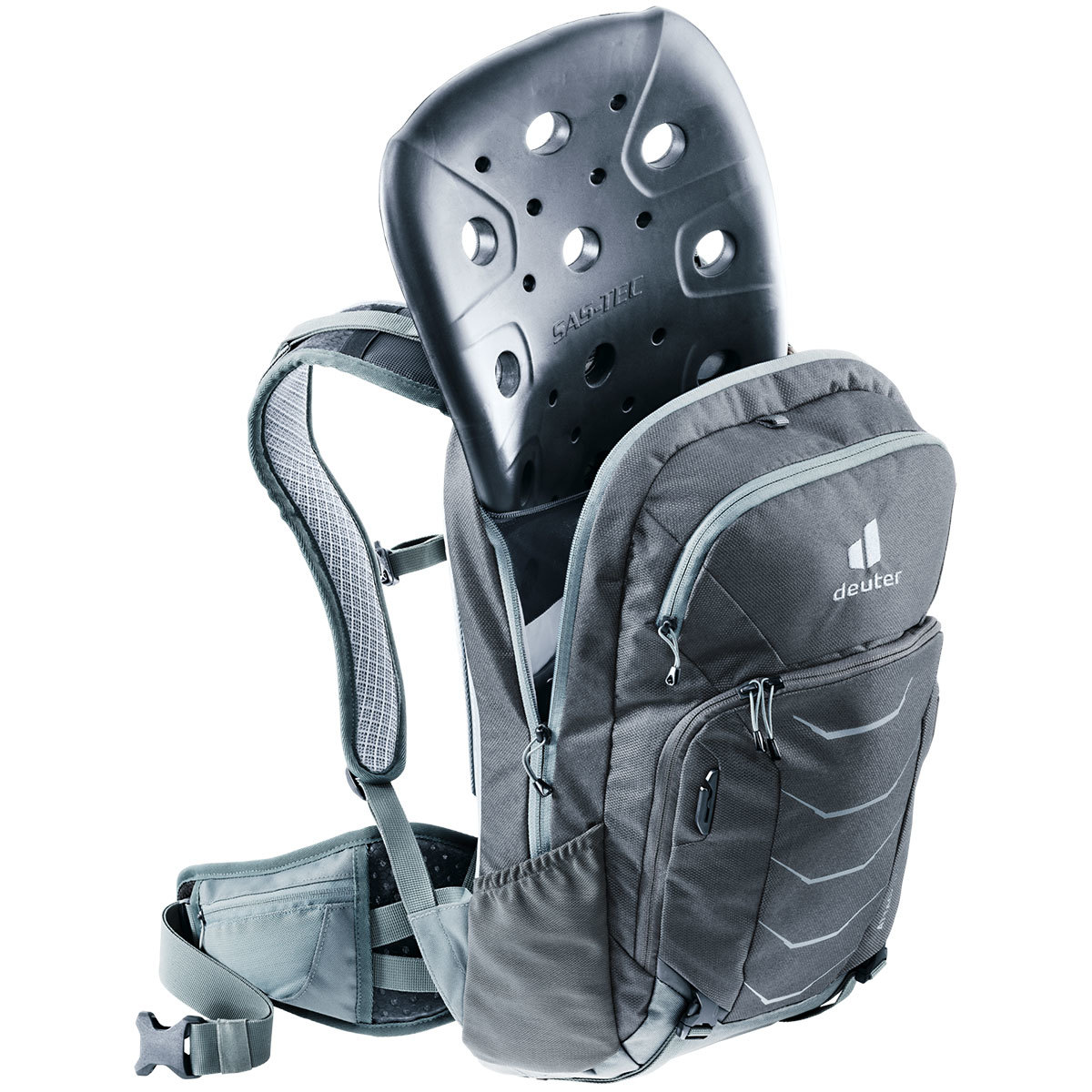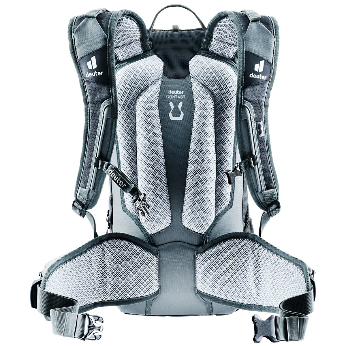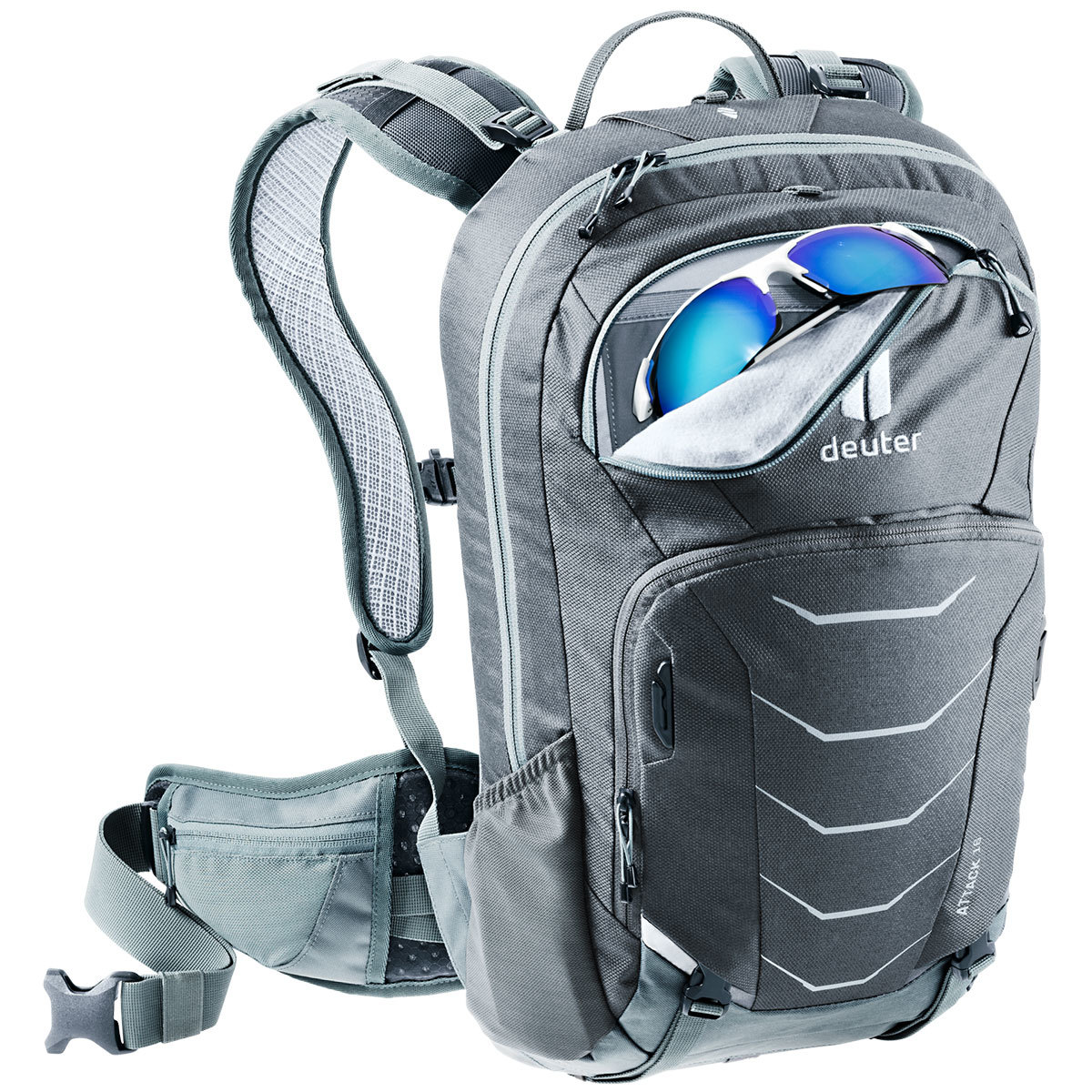 De deuter Attack 16 Fietsrugzak is een compacte en comfortabele rugzak die ontworpen is voor het mountainbiken. Dankzij de uitstekende ventilatie op het rugpand, en de ontelbare opbergmogelijkheden kan je op een comfortabele manier al je essentials meenemen. Het slanke design laat de rugzak compact en stabiel aanvoelen. Naast het zeer goed ademende rugpand, zijn ook de schouderriemen met Mesh gevoerd, voor een nog beter ademend vermogen. Daarnaast bieden ze voldoende bewegingsvrijheid. De tas is voorzien van een uitneembare rugbeschermer welke gemaakt is van speciaal Memory Foam, welke na een impact terugkomt in de originele vorm. Hierdoor blijft deze protector ook effectief na meerdere crashes. Het rugpand is tevens voorzien van het Contact rugsysteem, wat zorgt voor optimale verdeling van de druk van de rugzak verdeeld wordt. Je helm kan je gemakkelijk aan de voorzijde van de tas bevestigen, zodat deze geen ruimte inneemt in de tas. Met de slijtvaste Carrying Guard kan je je fiets op de rugtas dragen wanneer je een stuk moet lopen. De DWR coating voorziet de tas van een waterafstotende laag, zodat vocht niet naar binnen dringt. De tas is vrij van polyfluorchemicaliën, waardoor er minder milieubelastende stoffen gebruikt zijn bij het produceren van deze tas. De reflecterende elementen zorgen ervoor dat je ook in donkere omstandigheden goed zichtbaar bent, en daarnaast kan je aan de lus op de voorzijde een achterlicht bevestigen.
