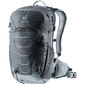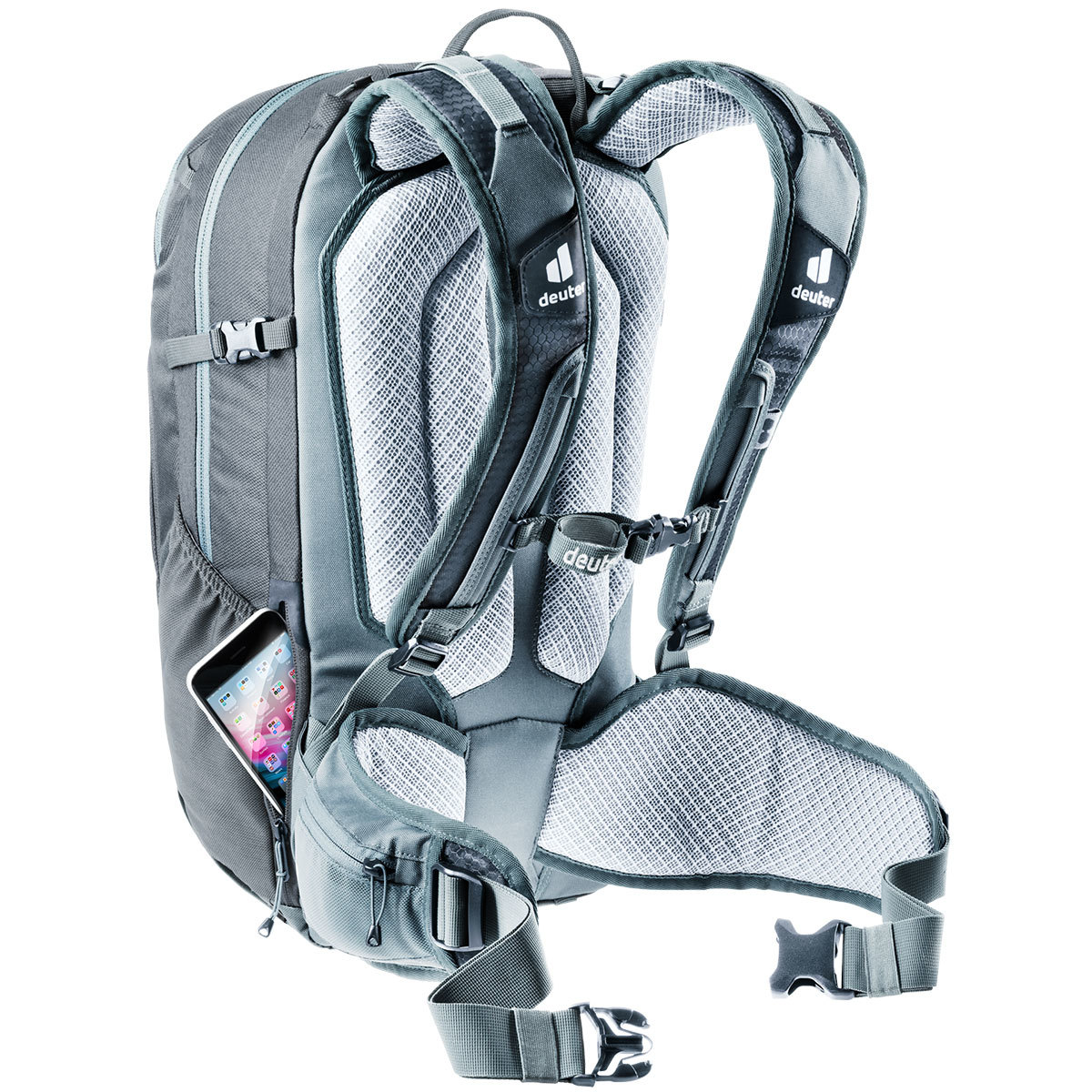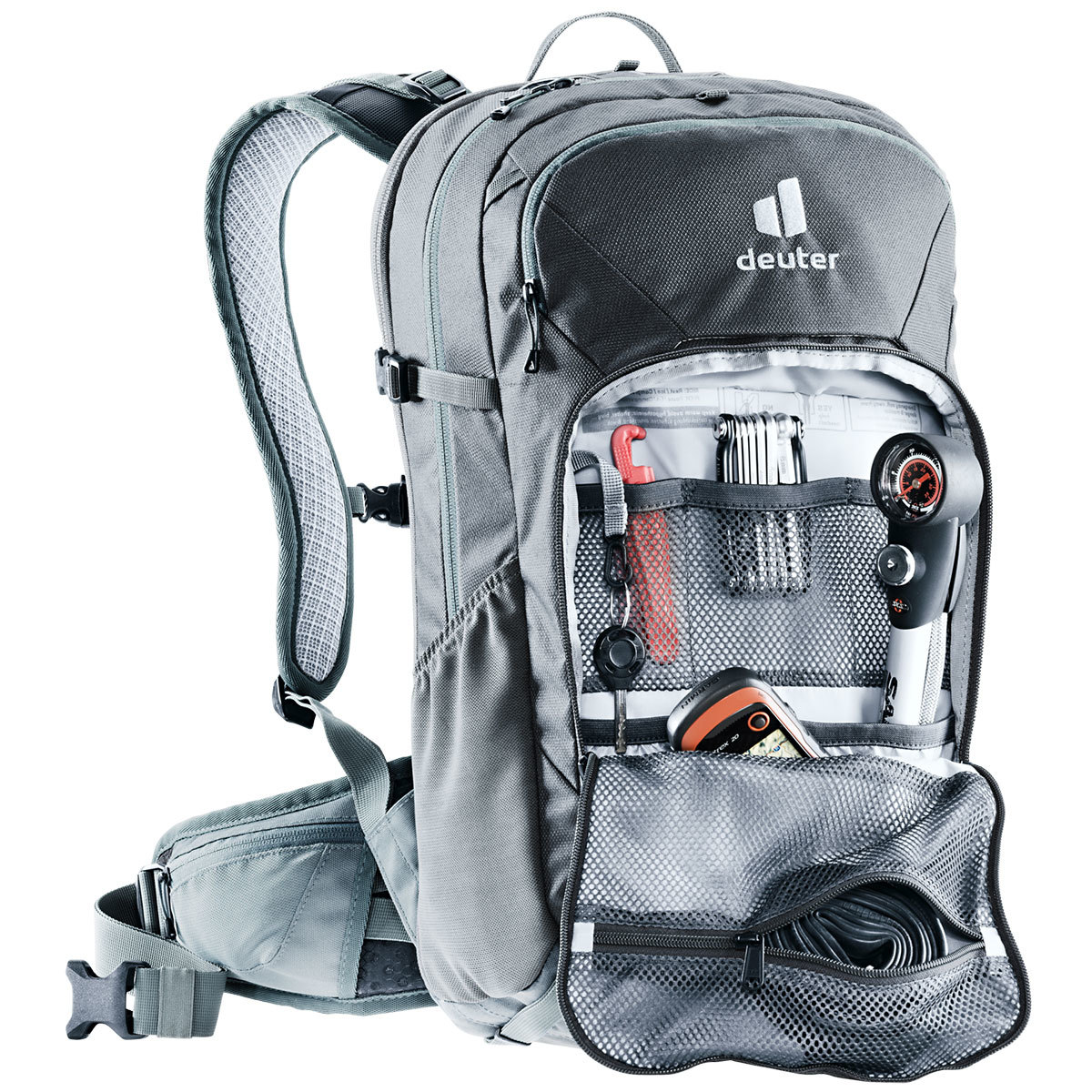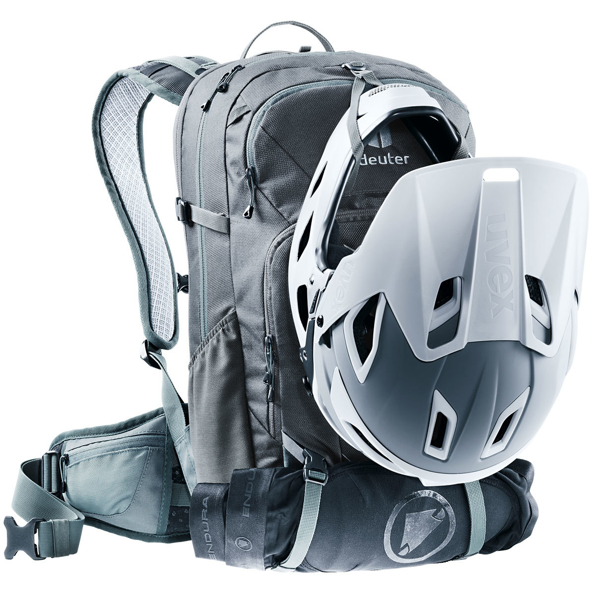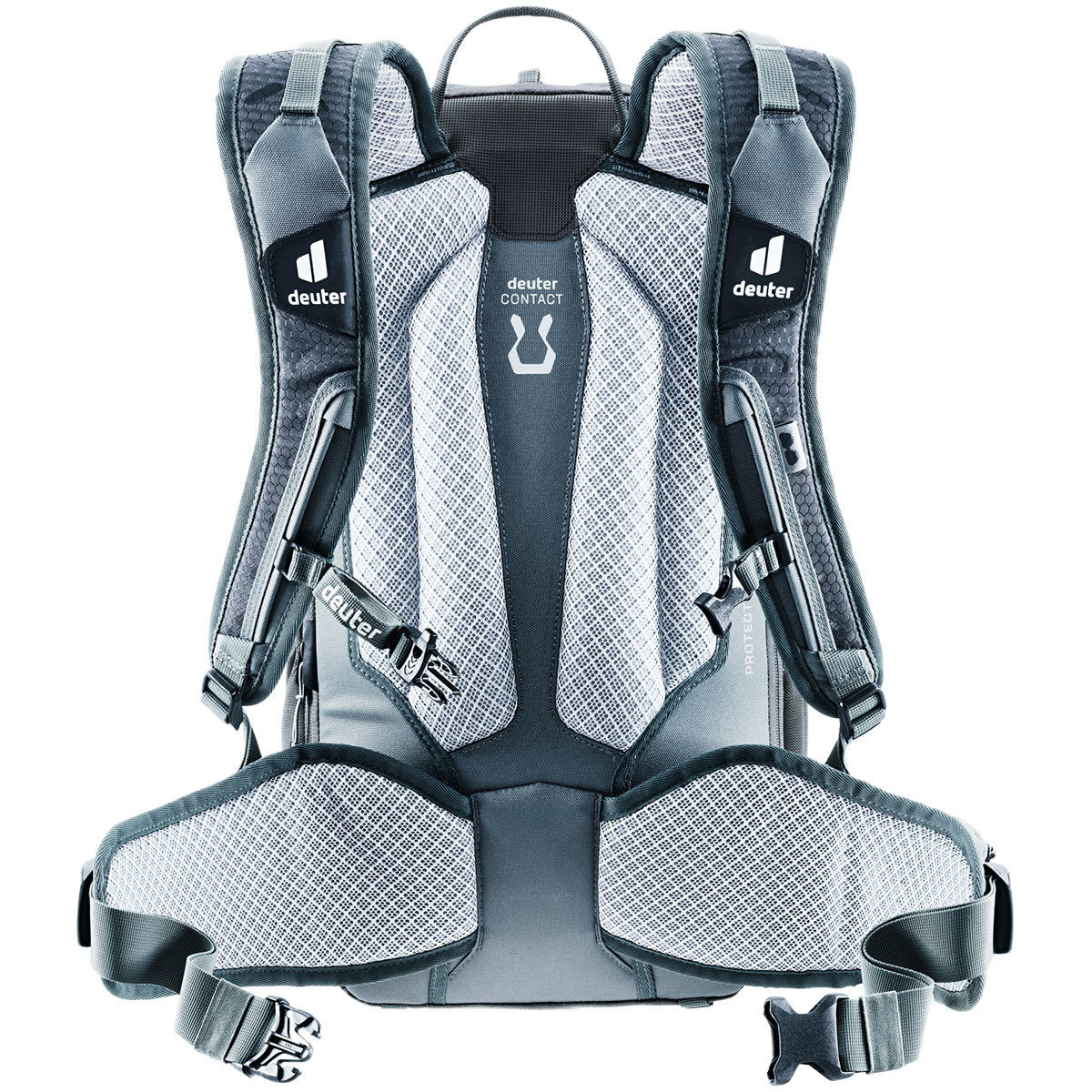 De deuter Attack 20 Fietsrugzak is een compacte en comfortabele rugzak die ontworpen is voor het mountainbiken. Dankzij de uitstekende ventilatie op het rugpand, en de ontelbare opbergmogelijkheden kan je op een comfortabele manier al je essentials meenemen. Het slanke design laat de rugzak compact en stabiel aanvoelen. Naast het zeer goed ademende rugpand, zijn ook de schouderriemen met Mesh gevoerd, voor een nog beter ademend vermogen. Daarnaast bieden ze voldoende bewegingsvrijheid. De tas is voorzien van een uitneembare rugbeschermer welke gemaakt is van speciaal Memory Foam, welke na een impact terugkomt in de originele vorm. Hierdoor blijft deze protector ook effectief na meerdere crashes. Het rugpand is tevens voorzien van het Contact rugsysteem, wat zorgt voor optimale verdeling van de druk van de rugzak verdeeld wordt. Je helm kan je gemakkelijk aan de voorzijde van de tas bevestigen, zodat deze geen ruimte inneemt in de tas. Met de slijtvaste Carrying Guard kan je je fiets op de rugtas dragen wanneer je een stuk moet lopen. De DWR coating voorziet de tas van een waterafstotende laag, zodat vocht niet naar binnen dringt. De tas is vrij van polyfluorchemicaliën, waardoor er minder milieubelastende stoffen gebruikt zijn bij het produceren van deze tas. De reflecterende elementen zorgen ervoor dat je ook in donkere omstandigheden goed zichtbaar bent, en daarnaast kan je aan de lus op de voorzijde een achterlicht bevestigen.