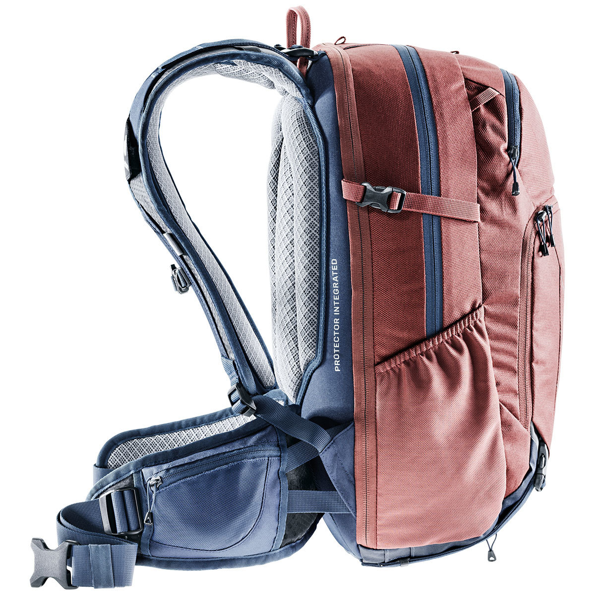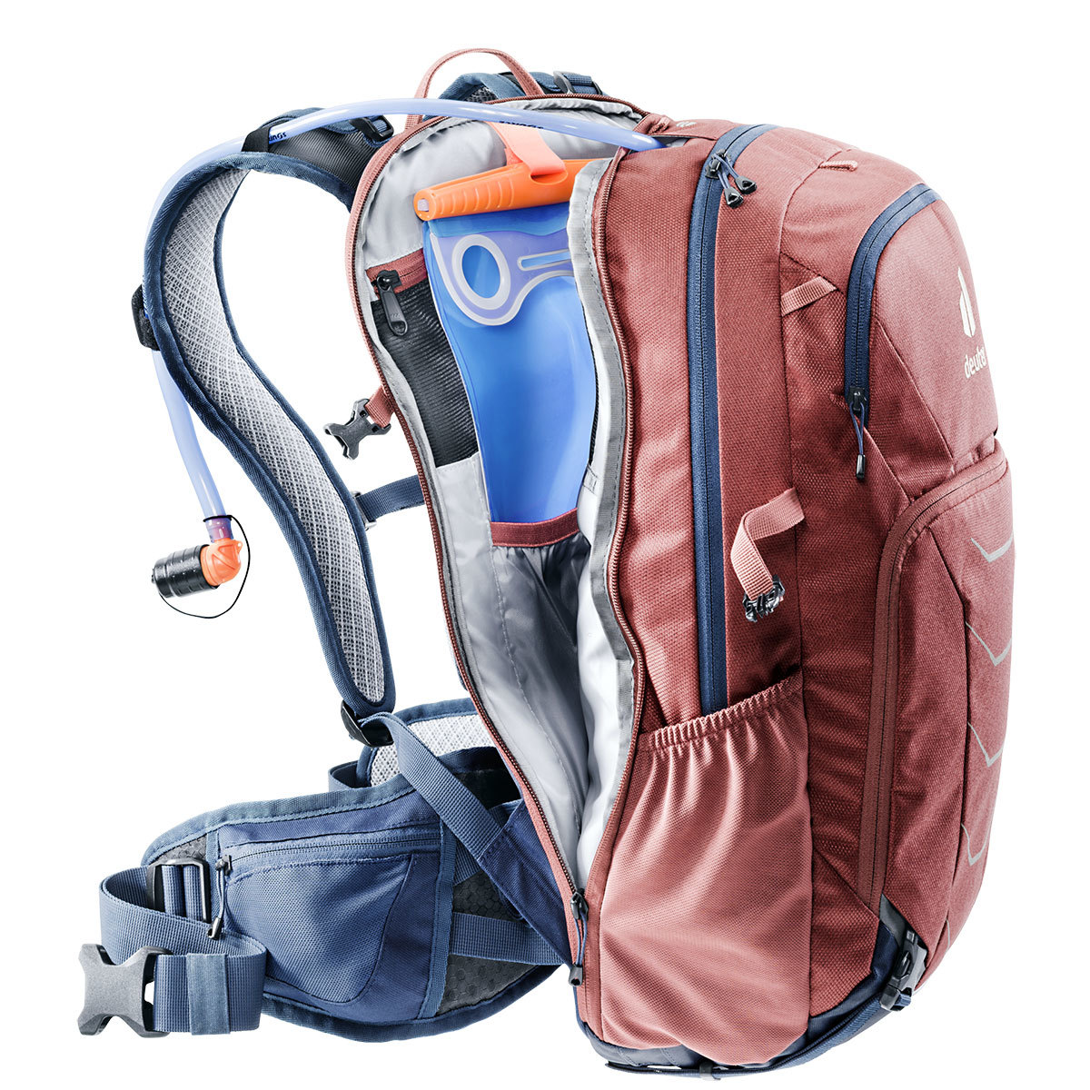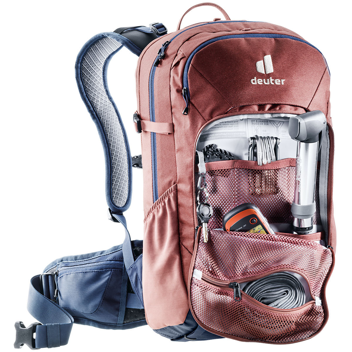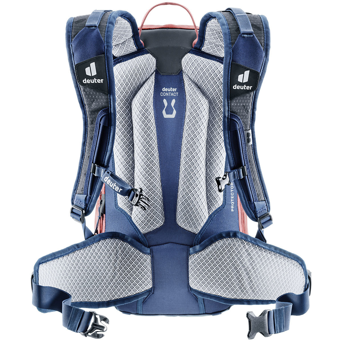 De deuter Attack 20 Fietsrugzak is een compacte en comfortabele rugzak die ontworpen is voor het mountainbiken. Dankzij de uitstekende ventilatie op het rugpand, en de ontelbare opbergmogelijkheden kan je op een comfortabele manier al je essentials meenemen. Het slanke design laat de rugzak compact en stabiel aanvoelen. Naast het zeer goed ademende rugpand, zijn ook de schouderriemen met Mesh gevoerd, voor een nog beter ademend vermogen. Daarnaast bieden ze voldoende bewegingsvrijheid. De tas is voorzien van een uitneembare rugbeschermer welke gemaakt is van speciaal Memory Foam, welke na een impact terugkomt in de originele vorm. Hierdoor blijft deze protector ook effectief na meerdere crashes. Het rugpand is tevens voorzien van het Contact rugsysteem, wat zorgt voor optimale verdeling van de druk van de rugzak verdeeld wordt. Je helm kan je gemakkelijk aan de voorzijde van de tas bevestigen, zodat deze geen ruimte inneemt in de tas. Met de slijtvaste Carrying Guard kan je je fiets op de rugtas dragen wanneer je een stuk moet lopen. De DWR coating voorziet de tas van een waterafstotende laag, zodat vocht niet naar binnen dringt. De tas is vrij van polyfluorchemicaliën, waardoor er minder milieubelastende stoffen gebruikt zijn bij het produceren van deze tas. De reflecterende elementen zorgen ervoor dat je ook in donkere omstandigheden goed zichtbaar bent, en daarnaast kan je aan de lus op de voorzijde een achterlicht bevestigen.