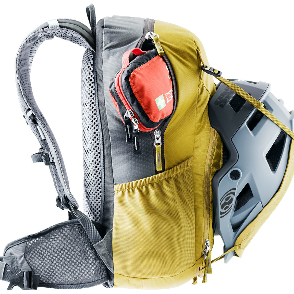 De deuter Bike I 20 Fietsrugzak is een extreem comfortabele rugzak. Dankzij de uitstekende ventilatie op het rugpand, en de ontelbare opbergmogelijkheden kan je op een comfortabele manier al je essentials meenemen. Het slanke design laat de rugzak compact en stabiel aanvoelen. Het rugpand is voorzien van het Airstripes rugsysteem, en heeft dus een innovatieve foam padding en luchtkanalen voor een goede ventilatie. Naast het zeer goed ademende rugpand, zijn ook de schouderriemen met Mesh gevoerd, voor een nog beter ademend vermogen. Daarnaast bieden ze voldoende bewegingsvrijheid. Je helm kan je gemakkelijk aan de voorzijde van de tas bevestigen, zodat deze geen ruimte inneemt in de tas. De DWR coating voorziet de tas van een waterafstotende laag, zodat vocht niet naar binnen dringt. De tas is vrij van polyfluorchemicaliën, waardoor er minder milieubelastende stoffen gebruikt zijn bij het produceren van deze tas. Dankzij de reflecterende elementen ben je ook in donkere omstandigheden goed zichtbaar.