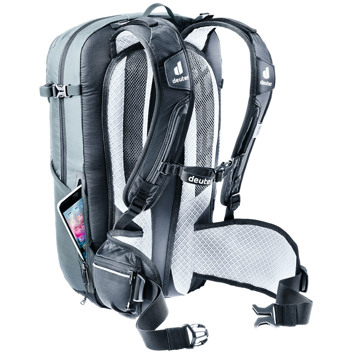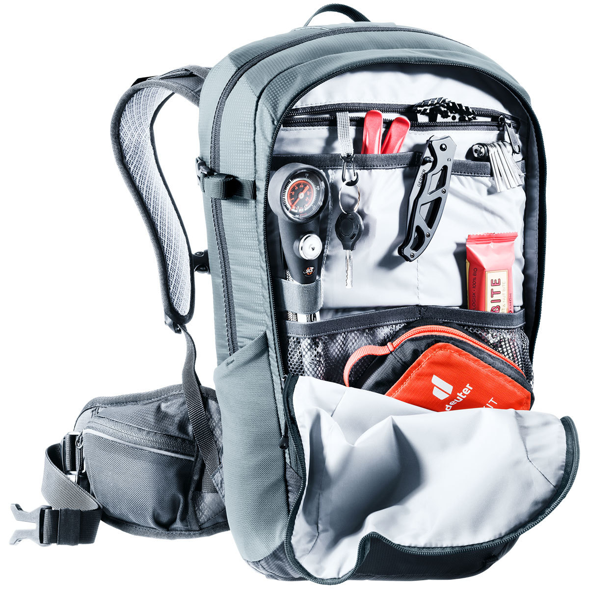 De deuter Flyt 12 Fietsrugzak is een compacte en comfortabele rugzak die ontworpen is voor het mountainbiken. Dankzij de uitstekende ventilatie op het rugpand, en de ontelbare opbergmogelijkheden kan je op een comfortabele manier al je essentials meenemen. Het slanke design laat de rugzak compact en stabiel aanvoelen. Het rugpand is voorzien van het Airstripes rugsysteem, en heeft dus een innovatieve foam padding en luchtkanalen voor een goede ventilatie. Naast het zeer goed ademende rugpand, zijn ook de schouderriemen met Mesh gevoerd, voor een nog beter ademend vermogen. Daarnaast bieden ze voldoende bewegingsvrijheid. De DWR coating voorziet de tas van een waterafstotende laag, zodat vocht niet naar binnen dringt. De tas is vrij van polyfluorchemicaliën, waardoor er minder milieubelastende stoffen gebruikt zijn bij het produceren van deze tas. De reflecterende elementen zorgen ervoor dat je ook in donkere omstandigheden goed zichtbaar bent, en daarnaast kan je aan de lus op de voorzijde een achterlicht bevestigen.